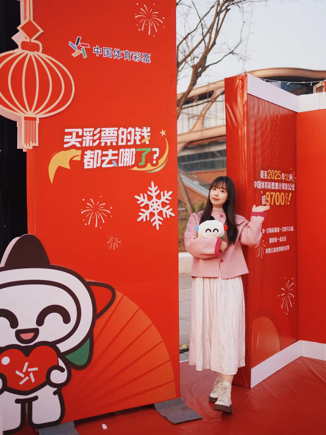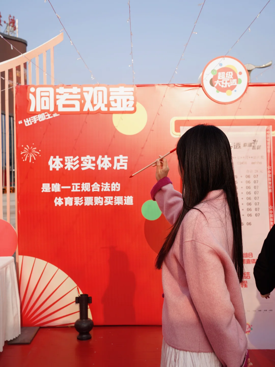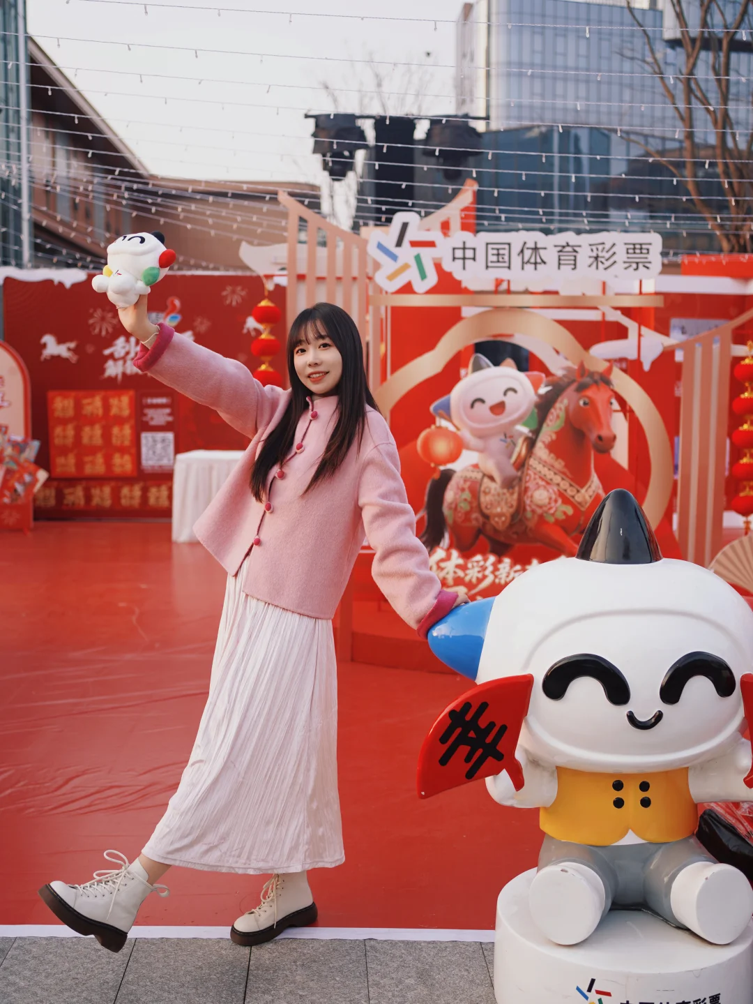 还没等走进彩灯大世界,我们就在门口的广场上,偶遇了一个年味拉满的“体彩新春季”市集。红红火火的布置,一下子就把我们吸引了过去。