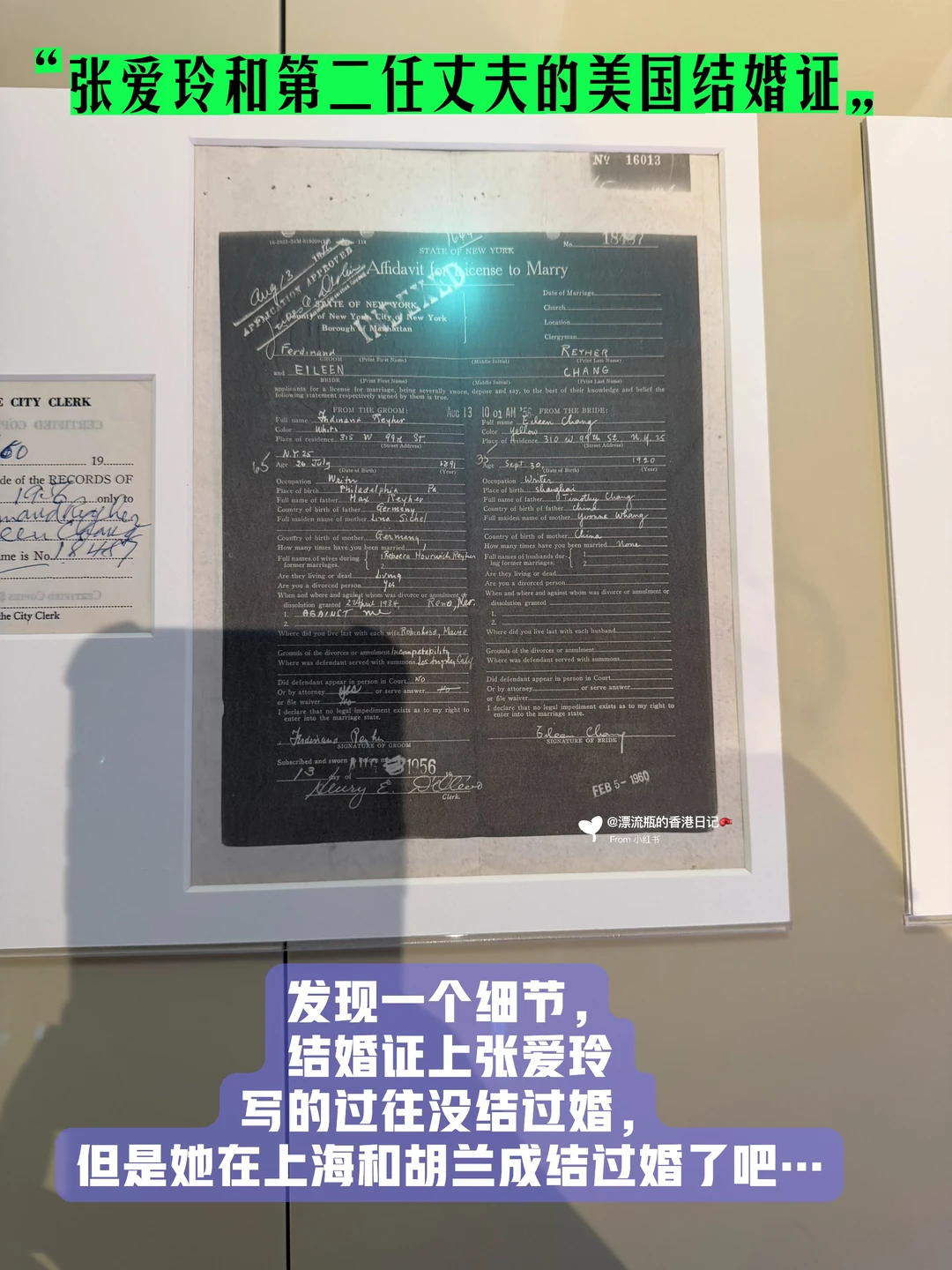 细节控的我发现张爱玲和第二任丈夫赖雅的美国结婚材料上写的是没有结过婚,但是张爱玲的第一任丈夫是胡兰成。倒是赖雅写了是第二次婚姻,也写了前妻名字…