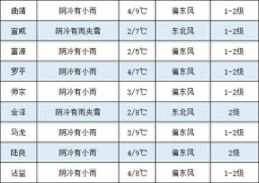 会泽、宣威、富源、沾益、麒麟(含经开区)、马龙、陆良、师宗、罗平森林火险气象等级4级(较低)。