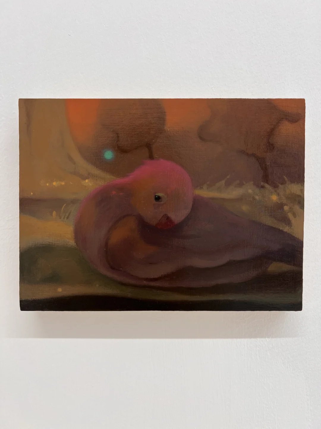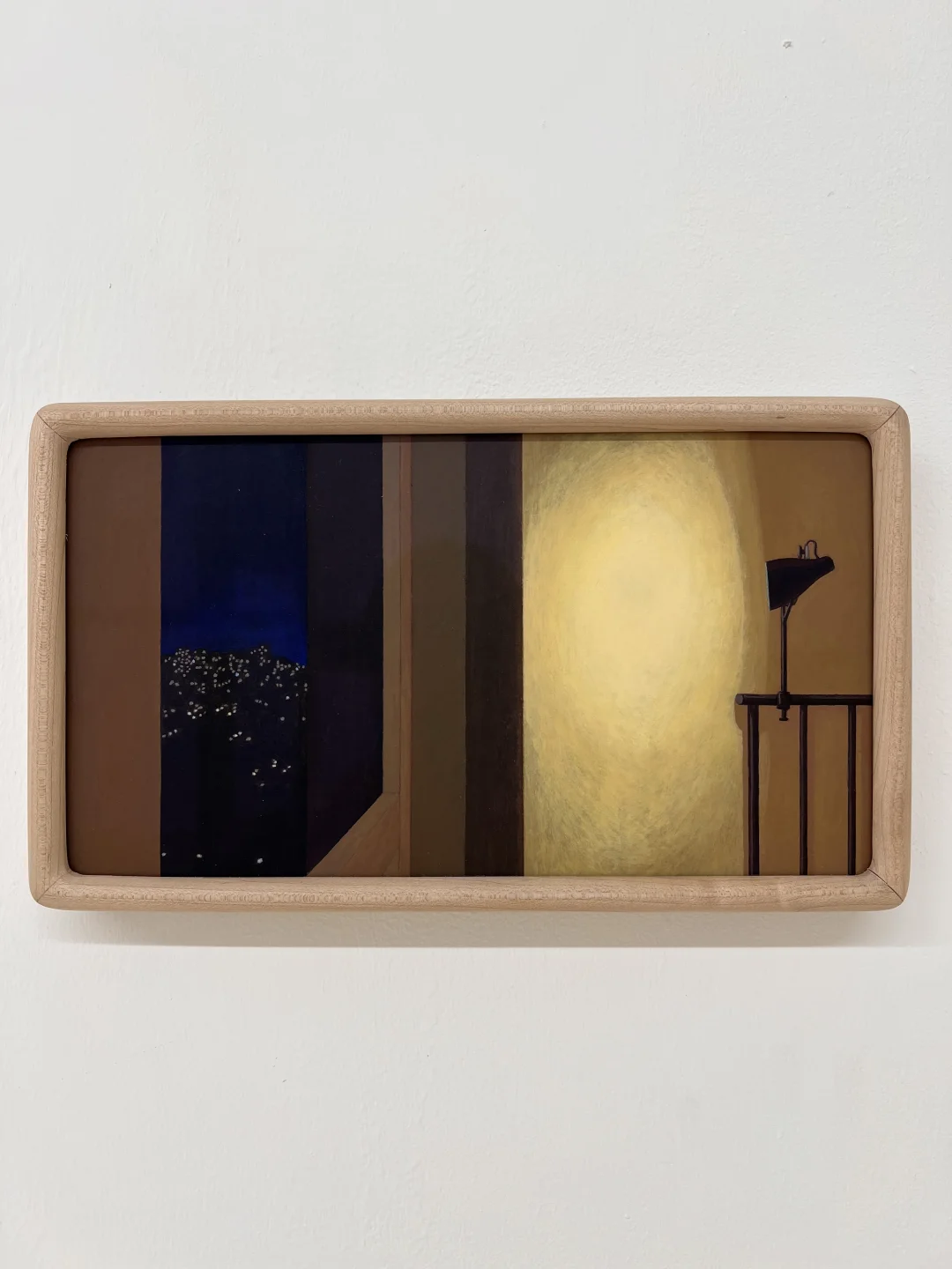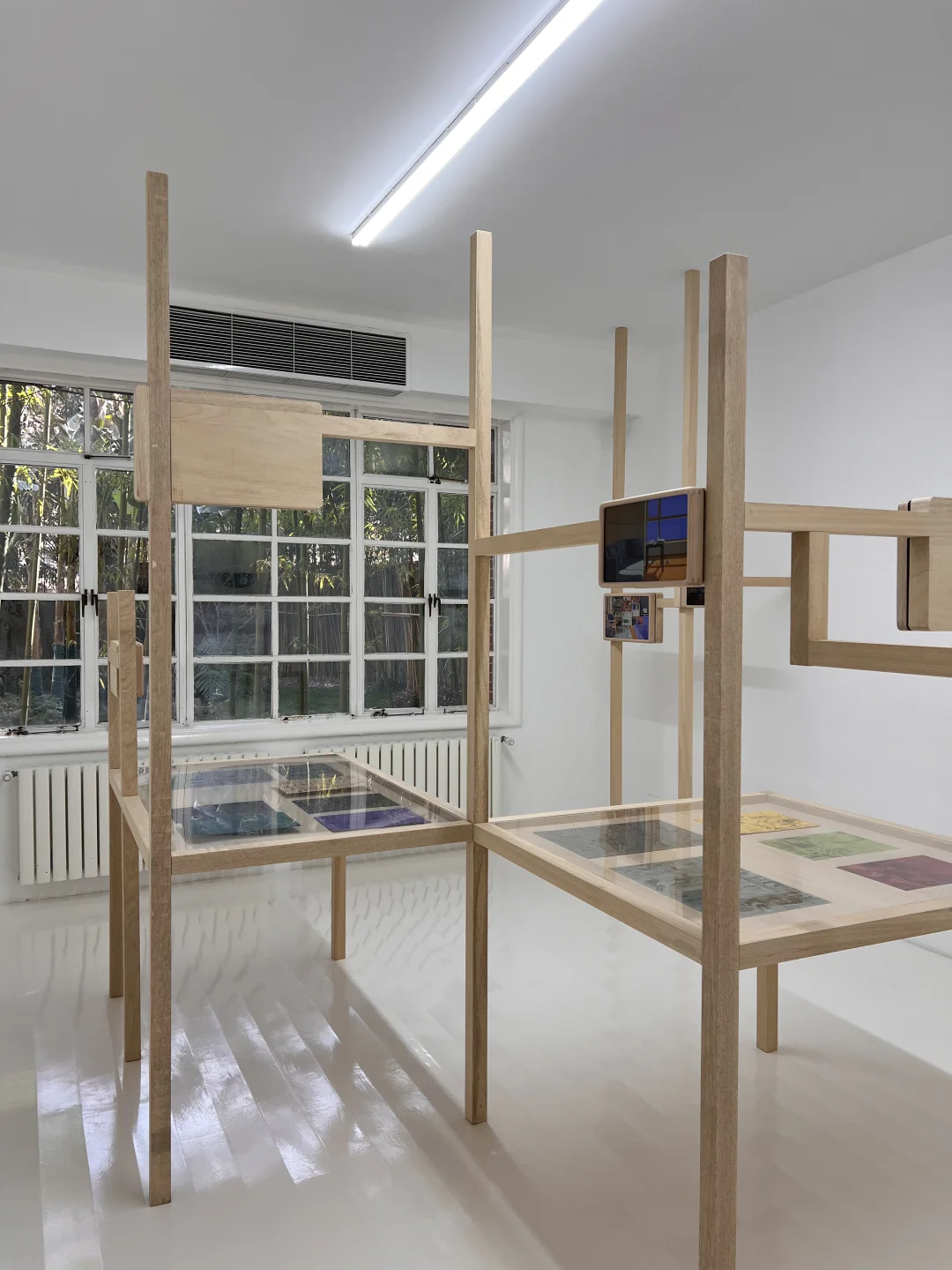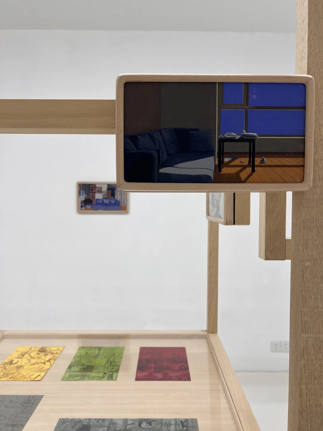 木质脚手架一样的画架上是小幅的绘画作品