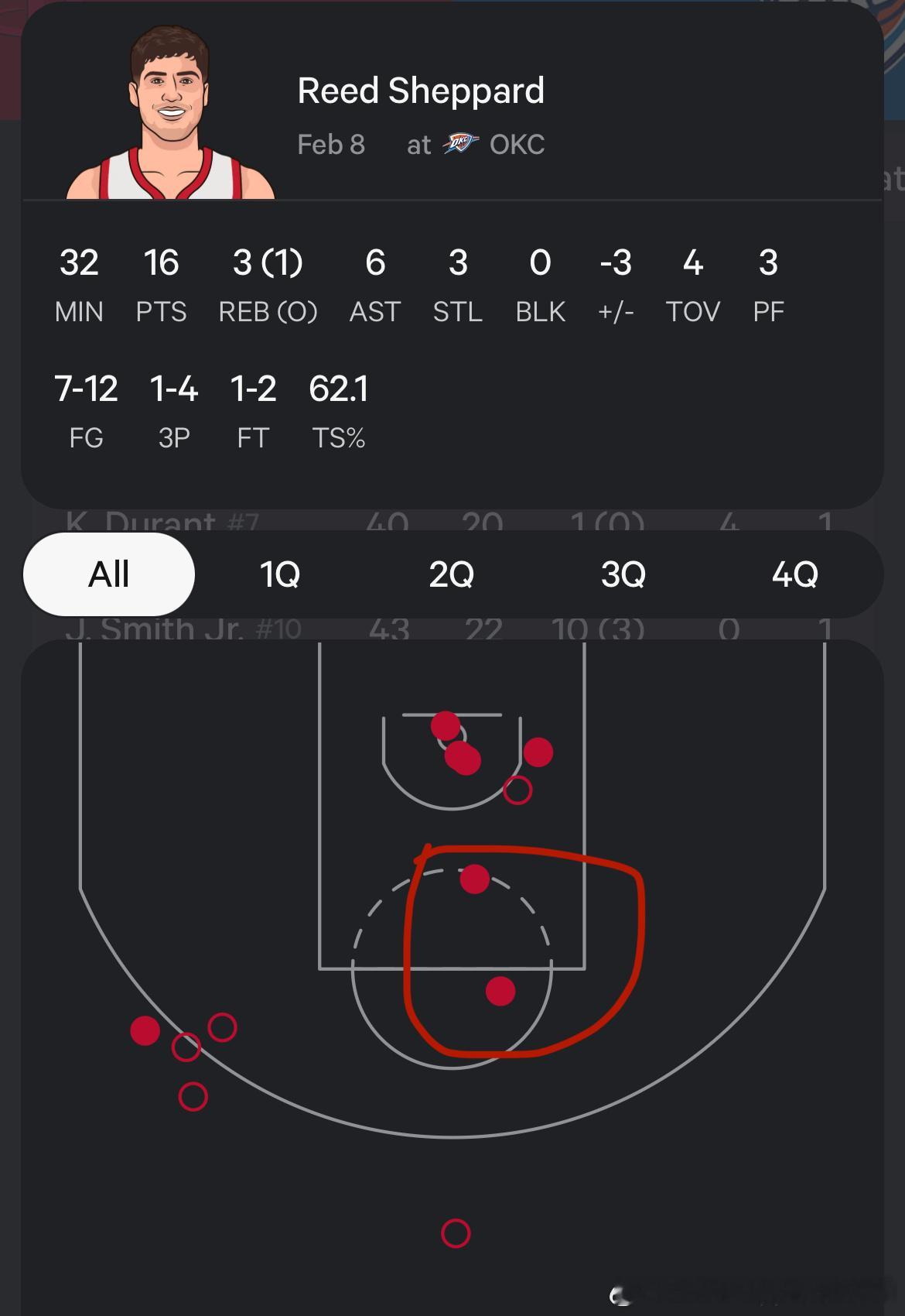 限制对手投篮命中率上:申京29.4%(对手17中5)史密斯40%(对手15中6)谢泼德46.7%(对手15中7)KD54.5%(对手11中6)伊森77.8%(对手9中7)