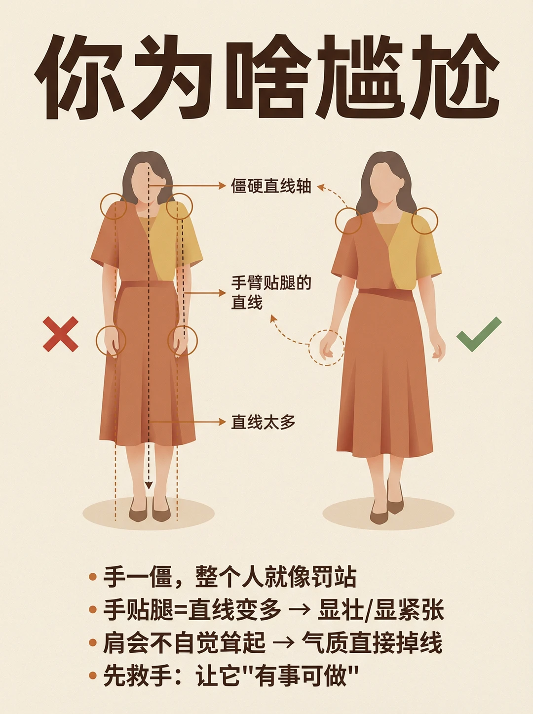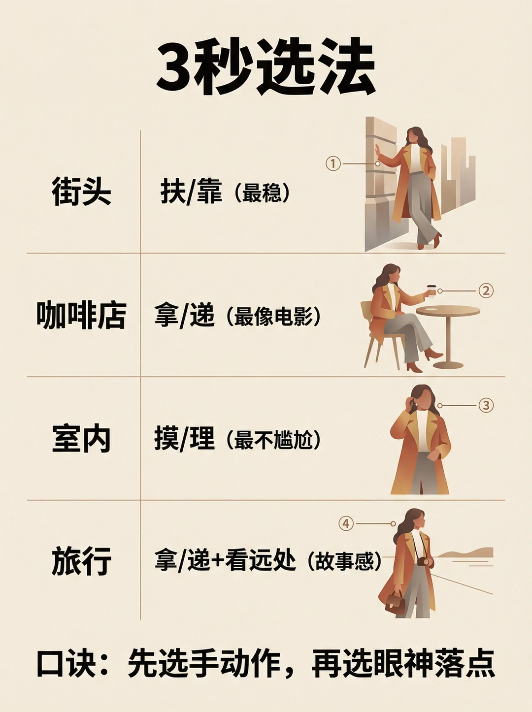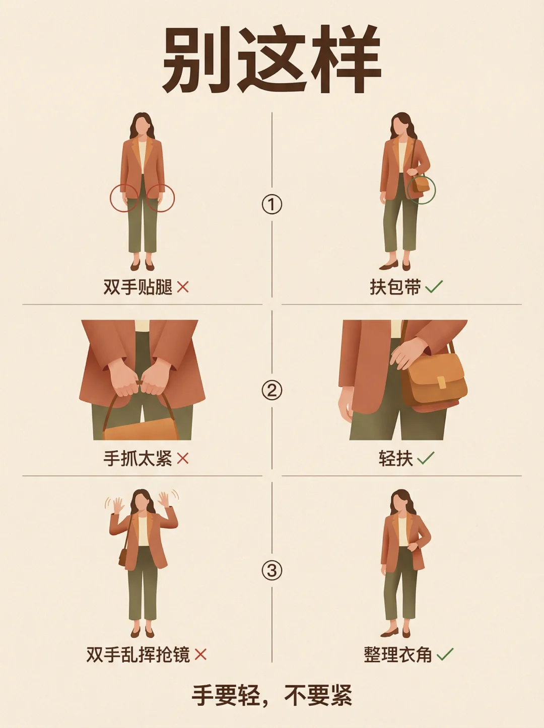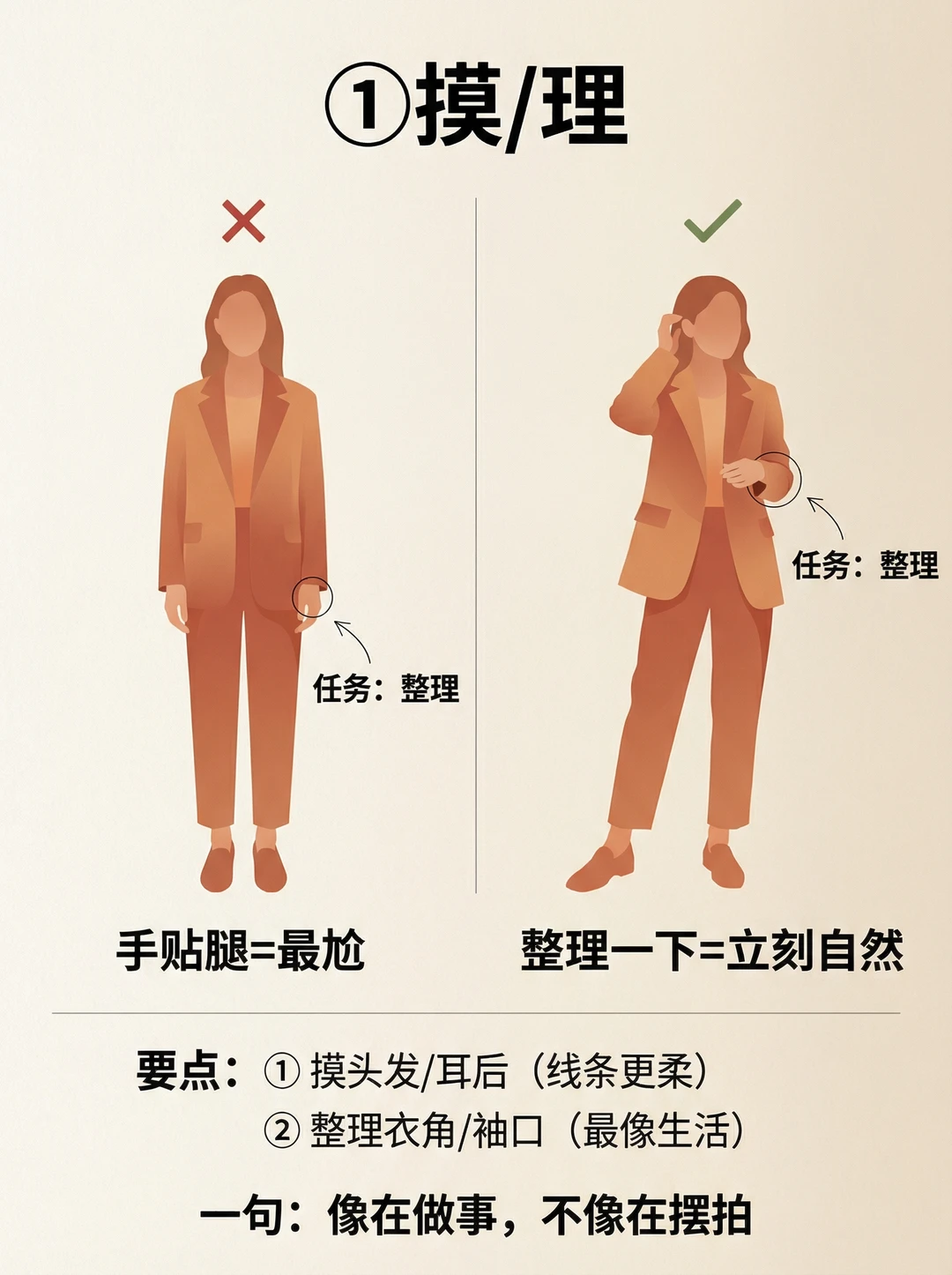 你有没有这种崩溃👇 📸 拍照时手不知道放哪:不是贴腿像罚站,就是乱摆更尴尬,整个人立刻变得紧张/显壮/没气质😩 其实手的问题不是“姿势少”,而是你没有让手有事可做✅ 这期我整理了3个通用手部动作,任何场景都能直接抄✨ 1)摸/理:摸头发、整理衣角,线条立刻变柔 2)扶/靠:扶包带/桌沿/栏杆,最稳不做作 3)拿/递:咖啡/手机/花当道具,最自然像生活 同时也帮你避坑:双手贴腿、抓太紧、抱胸太紧、手乱挥——这些最毁气质⚠️