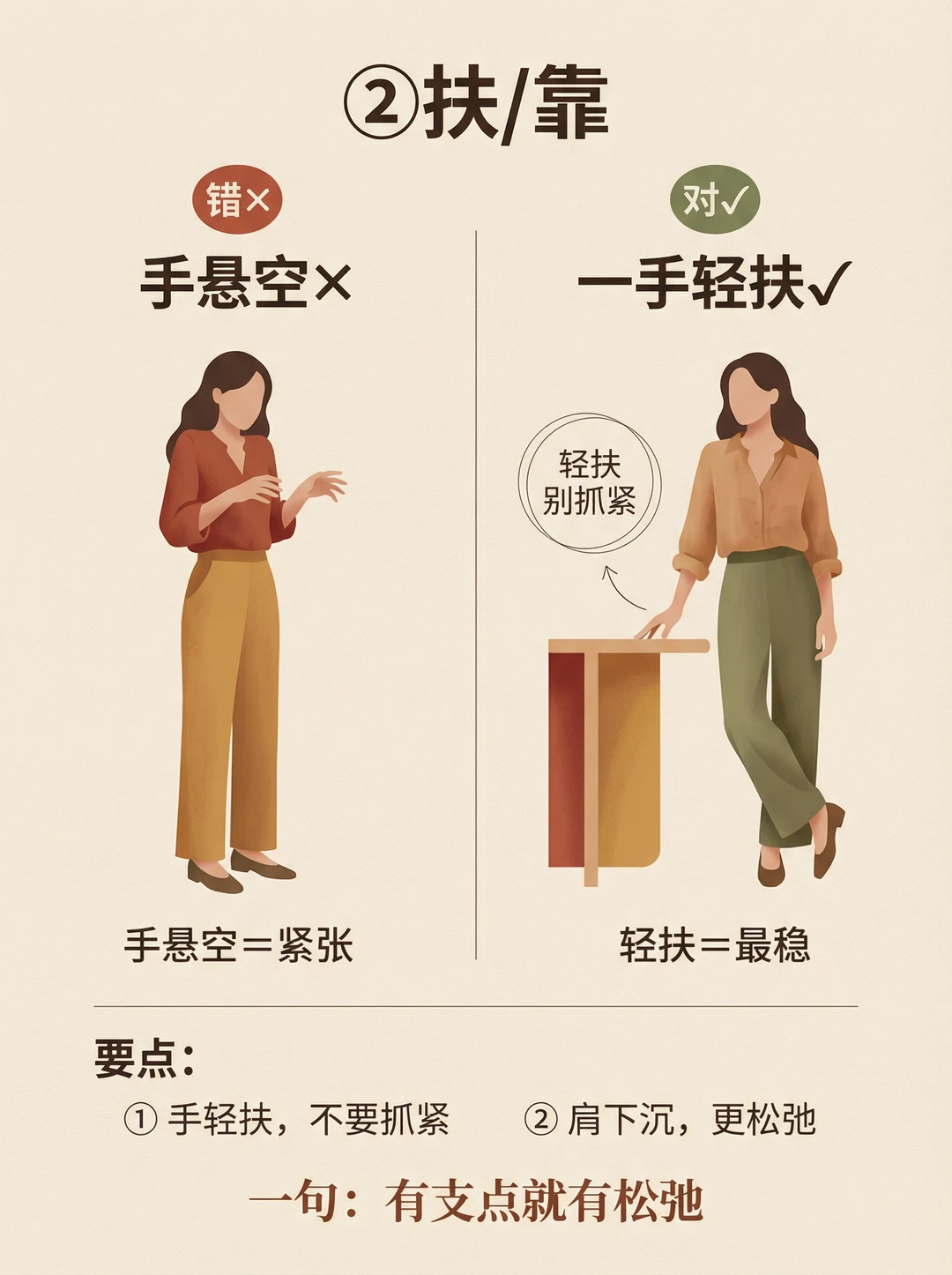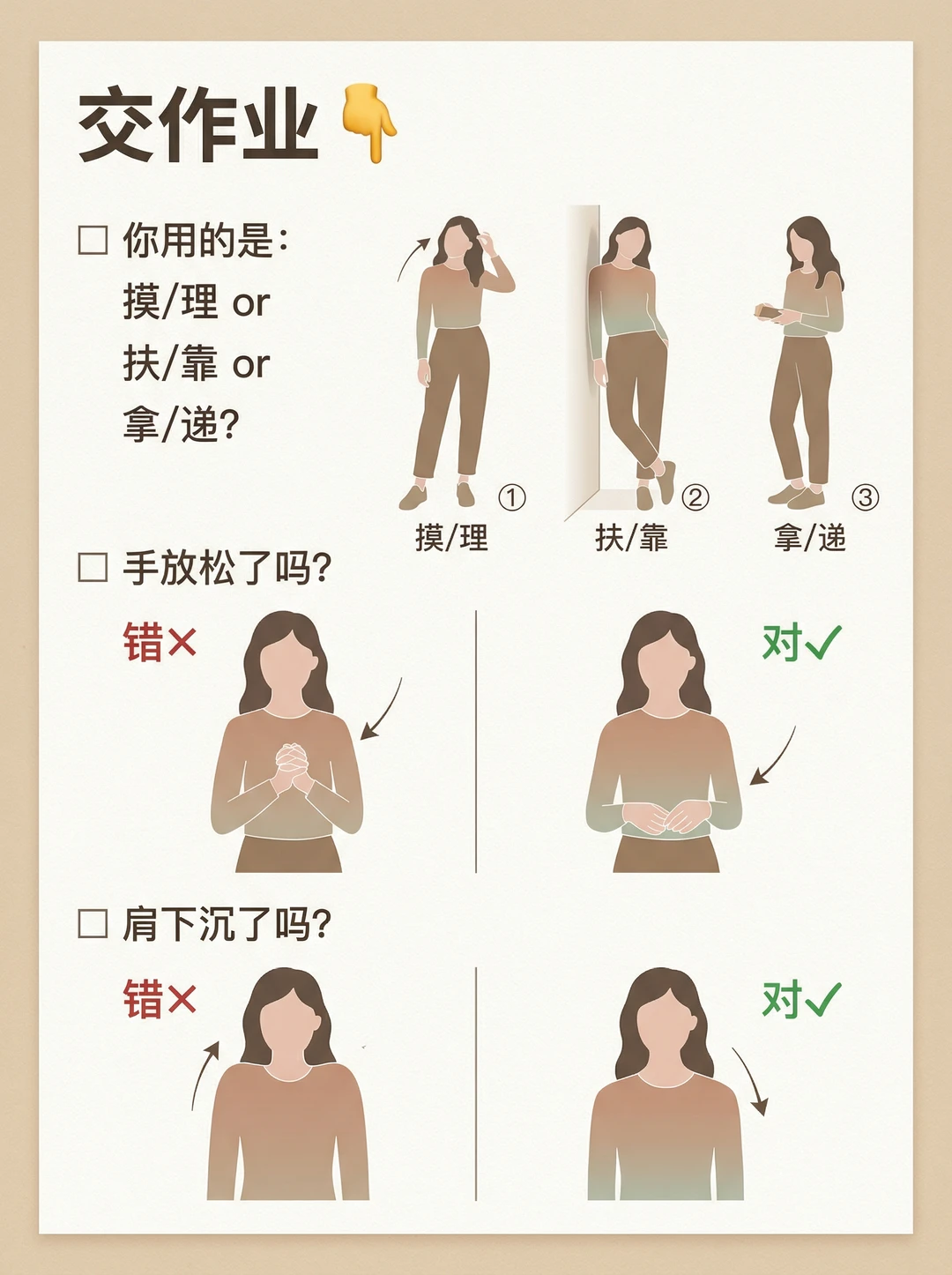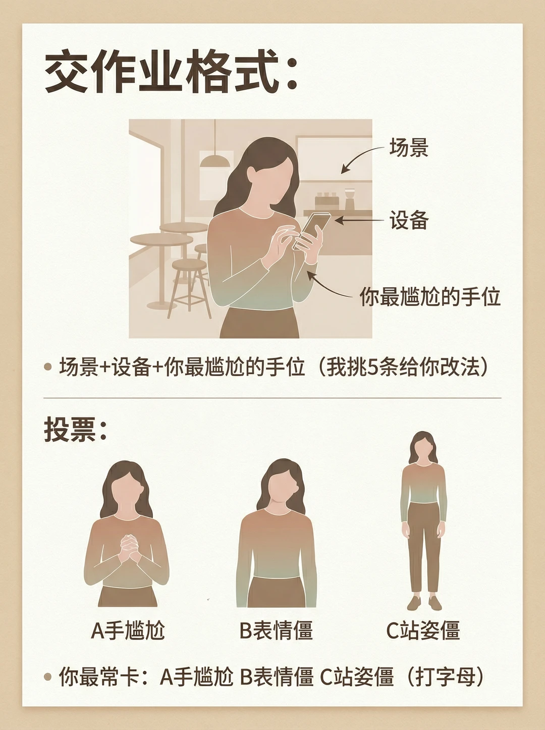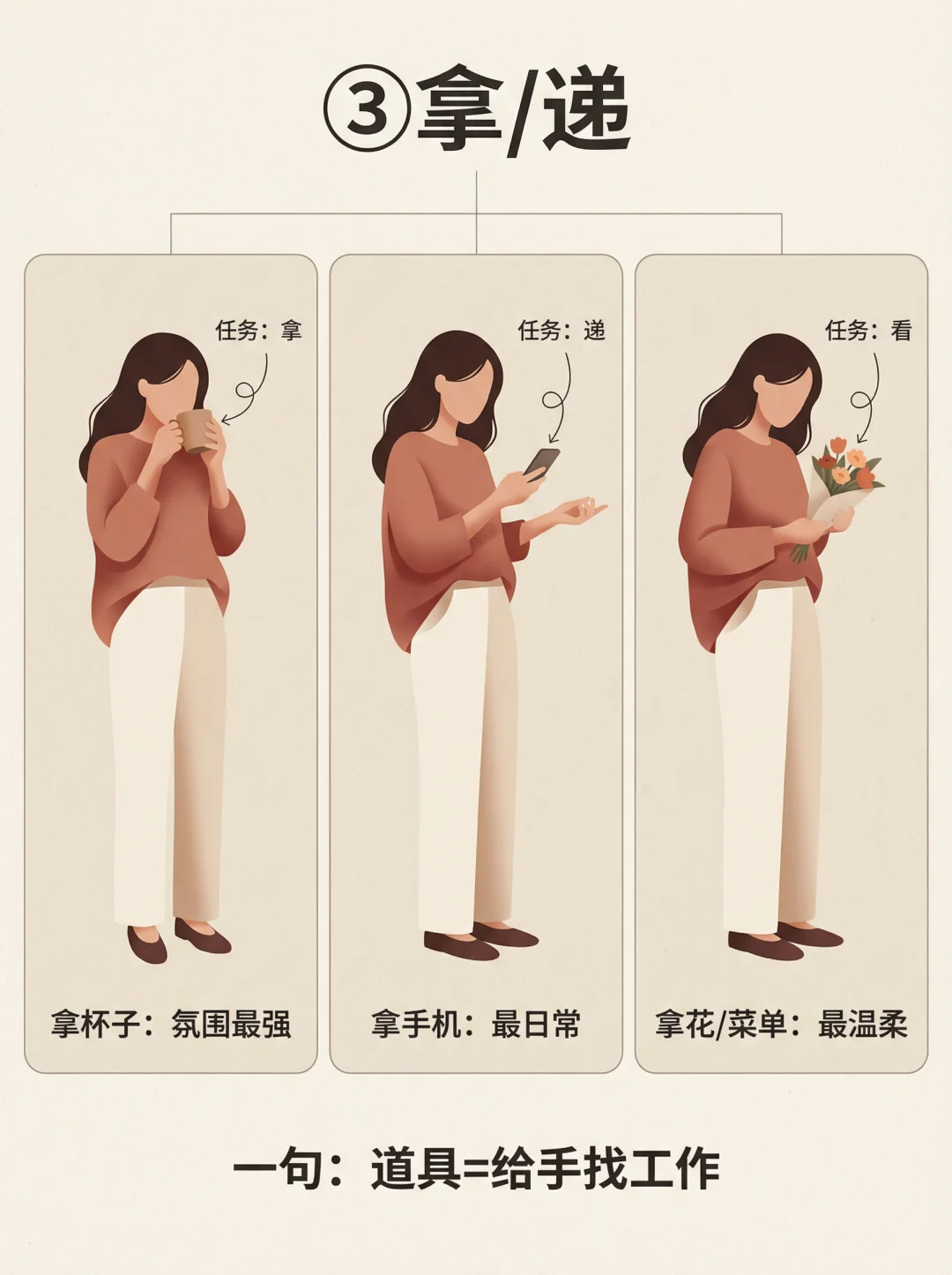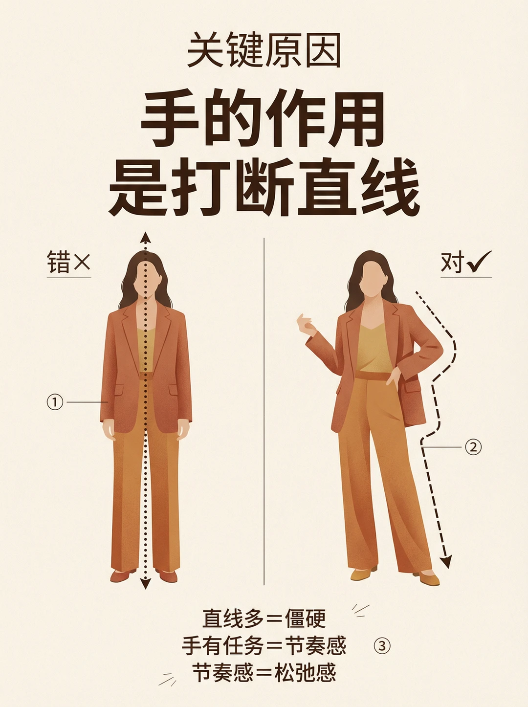 你有没有这种崩溃👇 📸 拍照时手不知道放哪:不是贴腿像罚站,就是乱摆更尴尬,整个人立刻变得紧张/显壮/没气质😩 其实手的问题不是“姿势少”,而是你没有让手有事可做✅ 这期我整理了3个通用手部动作,任何场景都能直接抄✨ 1)摸/理:摸头发、整理衣角,线条立刻变柔 2)扶/靠:扶包带/桌沿/栏杆,最稳不做作 3)拿/递:咖啡/手机/花当道具,最自然像生活 同时也帮你避坑:双手贴腿、抓太紧、抱胸太紧、手乱挥——这些最毁气质⚠️