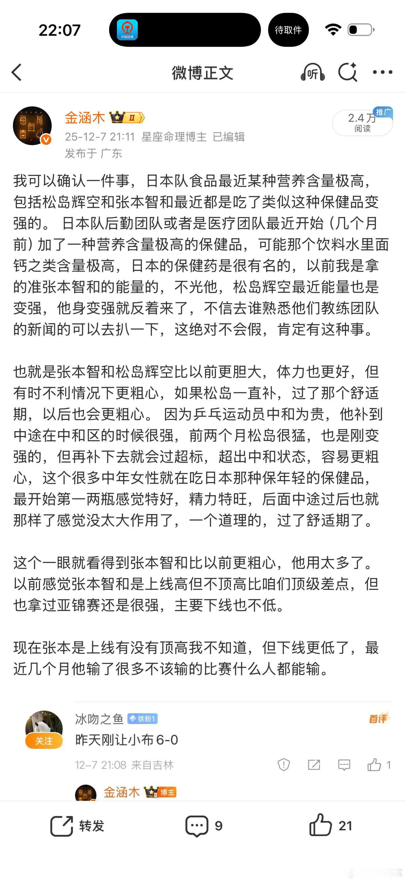 新粉丝不明白保健品怎么一回事的看这里就知道了,我根据他们以前的天时发现他们能量彻底改变,以前看他们的比赛加减成能预测很准的,他们补了比劫和印枭,日本队的金水命人。 张本智和是去年横滨赛前就开始吃了日本医疗团队的保健补品,变身强,松岛辉空也是。他两短短一两个月时间面貌一变变得很难缠意志力变坚定,如此巨大的改变你们不觉得诡异吗?