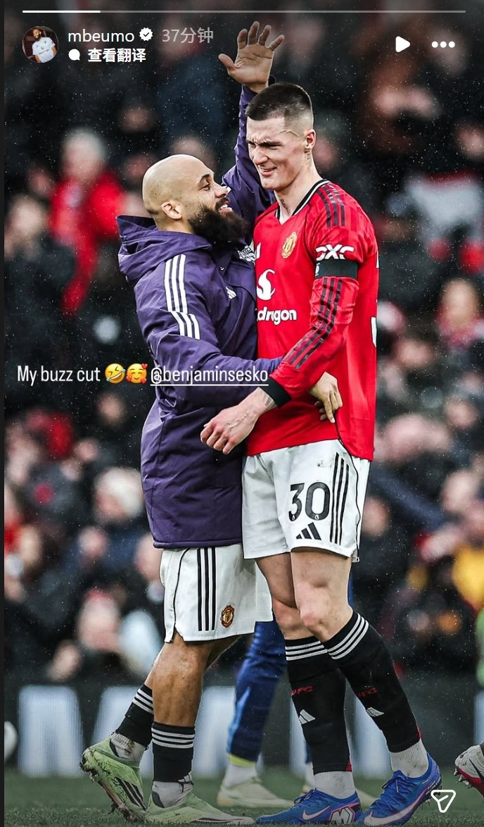 而姆伯莫也在今日通过社媒晒出自己和舍什科的合照,看起来似乎也是在调侃队友,并配文:“我的寸头哥”。