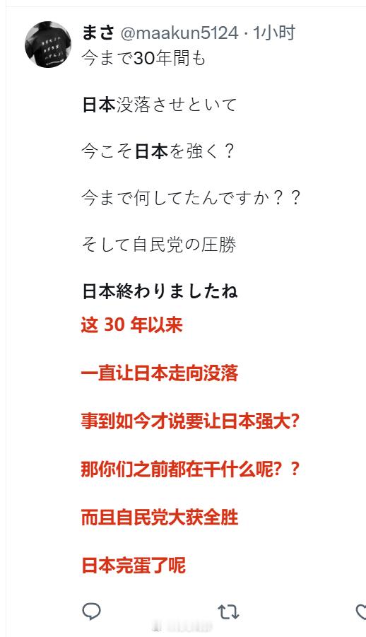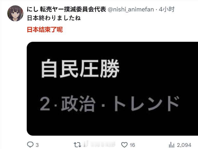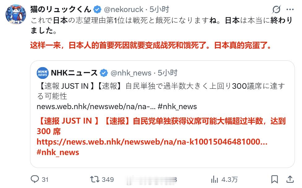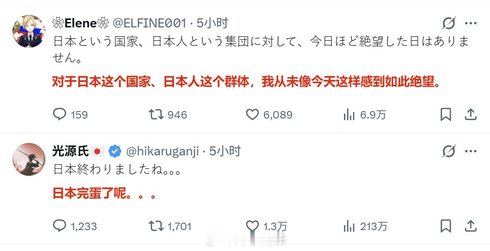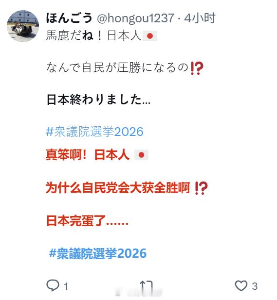 日本网右欢呼胜利的同时,也有一群日本人在哀嚎“日本完蛋了”。那现在谁是多数,谁是少数呢?仅仅是责怪右翼宣传和媒体“绑架”选民吗?所谓的民主选举啊,既然能选出希特勒,能选出特朗普,那当然也能选出高市早苗啊,你们还没明白这个道理吗?