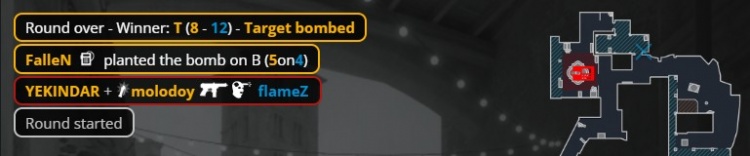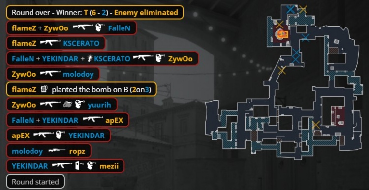 第8回合香蕉道狂哥再杀mezii,molodoy大狙架A1打掉ropz,apex在B换掉回防的狂哥,Zywoo打掉yuurih后在B下包再杀空枪的molodoy,火仔双杀收尾,小蜜蜂完成2v4残局,拿到第6分。