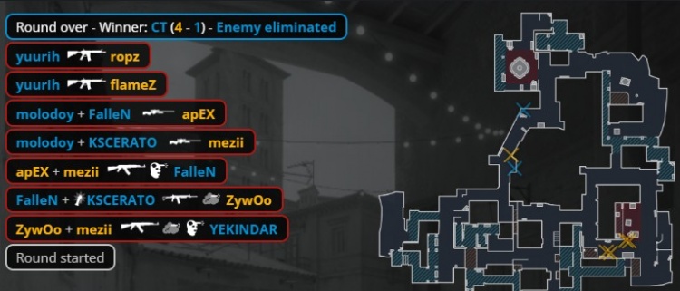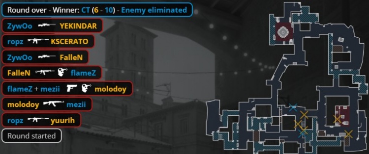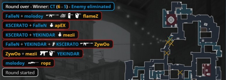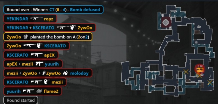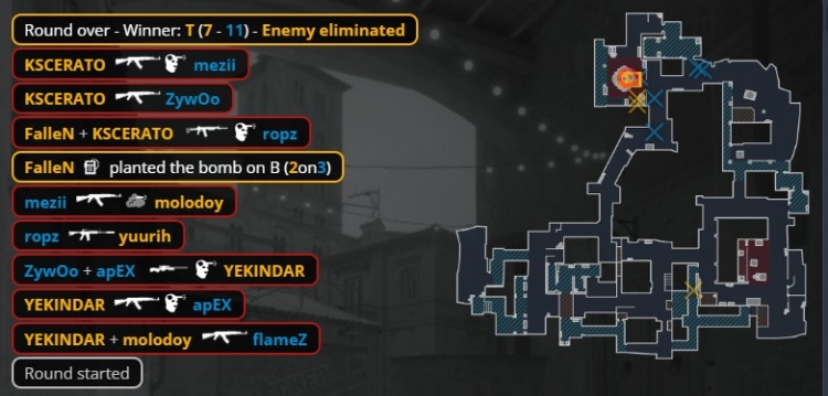 第16回合暂停回来,ropz中路反清打掉yuurih,molodoy打掉mezii后被换,Zywoo大狙架中路打掉教父,卡神与狂哥残局2v3,Zywoo大狙双杀,小蜜蜂拿到第10分。