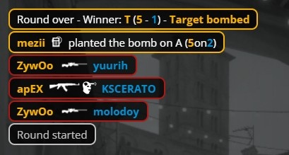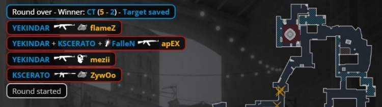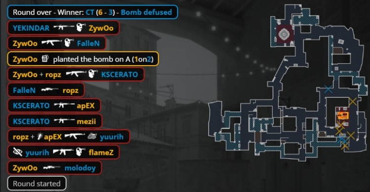 第18回合长枪局,香蕉道狂哥双杀火仔与apex,Zywoo回防先撒谎狂哥,ropz与mezii收掉yuurih与molodoy,教父在B下包后联手卡神双人三杀拿下2v3残局,黑豹拿到第7分。