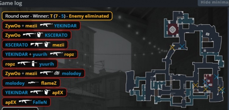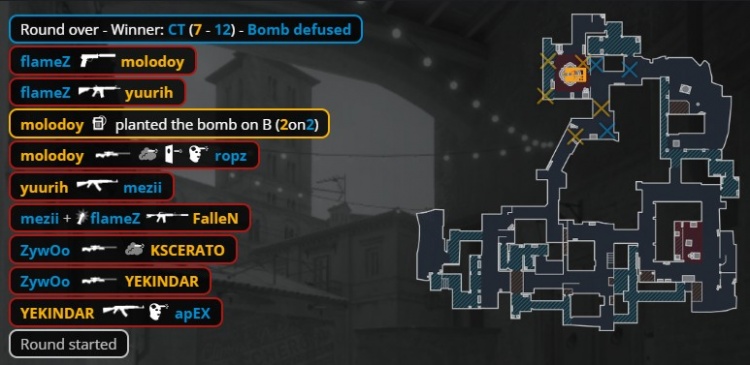第12回合香蕉道磕枪,apex换掉教父,molodoy大狙轰掉A1的火仔,Zywoo冲进A点混烟打掉molodoy,ropz穿掉yuurih,狂哥与卡神打掉ropz与mezii无济于事,Zywoo双杀收尾,小蜜蜂以7-5结束上半场。