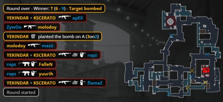 第9回合来到长枪局,Zywoo大狙先杀A连接molodoy,卡神A小坑双杀apex与mezii,教父大狙轰掉ropz,Zywoo进A爆杀卡神与教父后被狂哥补掉,黑豹拿到第3分。