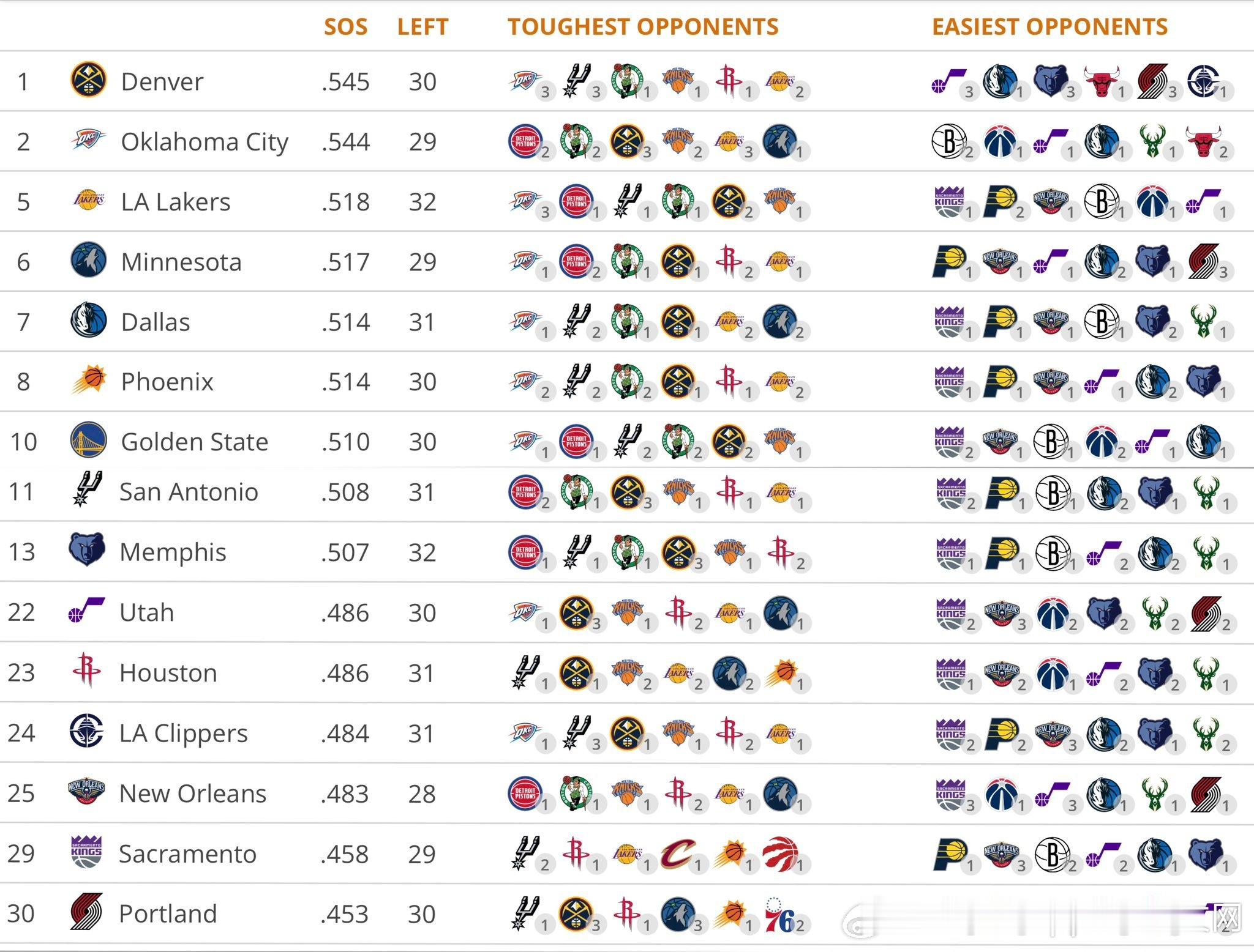 数据显示(图2):火箭目前剩余赛程的平均对手胜率为 48.6%,在全联盟排第 23 难,也意味着——👉 在当前西部前六球队里,火箭的剩余赛程理论上最轻松。对比两支直接西部竞争对手:掘金:54.5%(全联盟最难之一)雷霆:54.4%(同样接近最难)