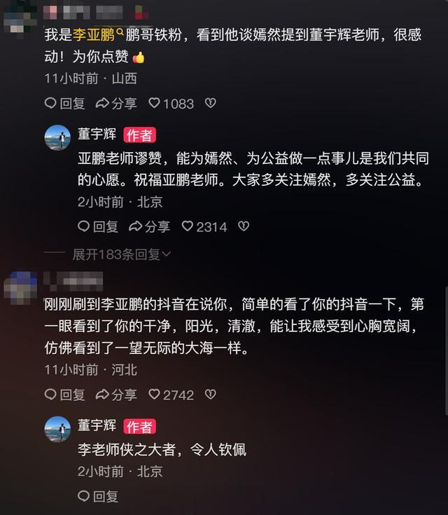 2月8日,有网友在董宇辉账号下评论。董宇辉回复称:“李老师侠之大者,令人钦佩。”董宇辉还表示:“能为嫣然、为公益做一点事儿是我们共同的心愿,祝福亚鹏老师。大家多关注嫣然,多关注公益。”