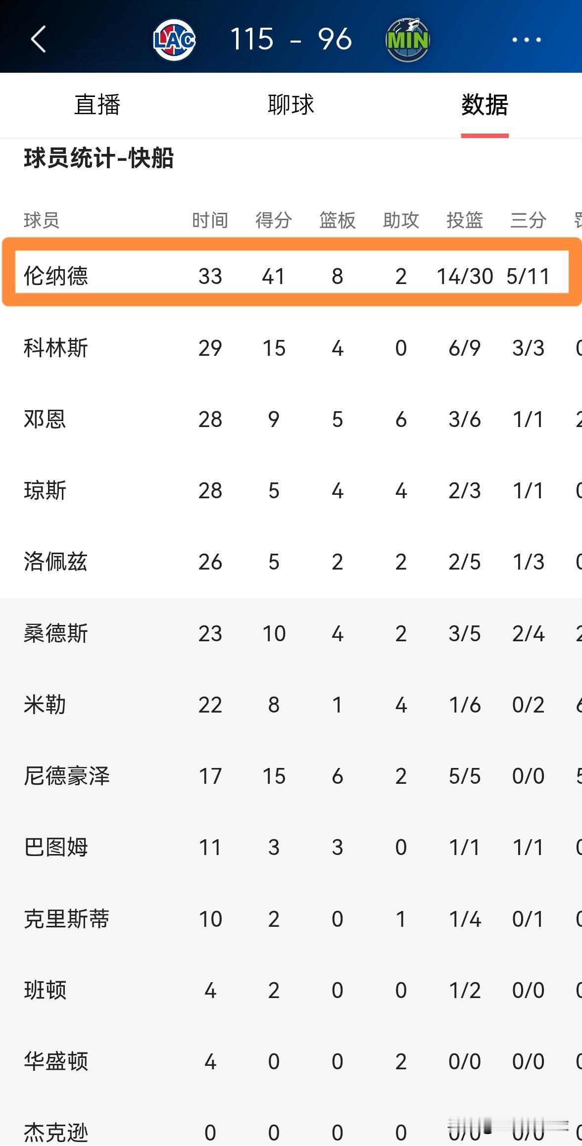 快船巨星伦纳德爆砍41分带队大胜森林狼!今天快船在客场以115:96大胜森林狼,此役伦纳德奉献了一场大师级别的得分表演,让人看的如痴如醉。 全场比赛下来,伦纳德首发出战33分钟,投篮30中14,其中三分球11中5、罚球10中8轰下41分8篮板2助攻4抢断,他的场上正负值为+20。 事实再次证明,快船将伦纳德视为非卖品不是没有原因的,只要伦纳德能够保持健康,快船就拥有杀进西部前六的希望。