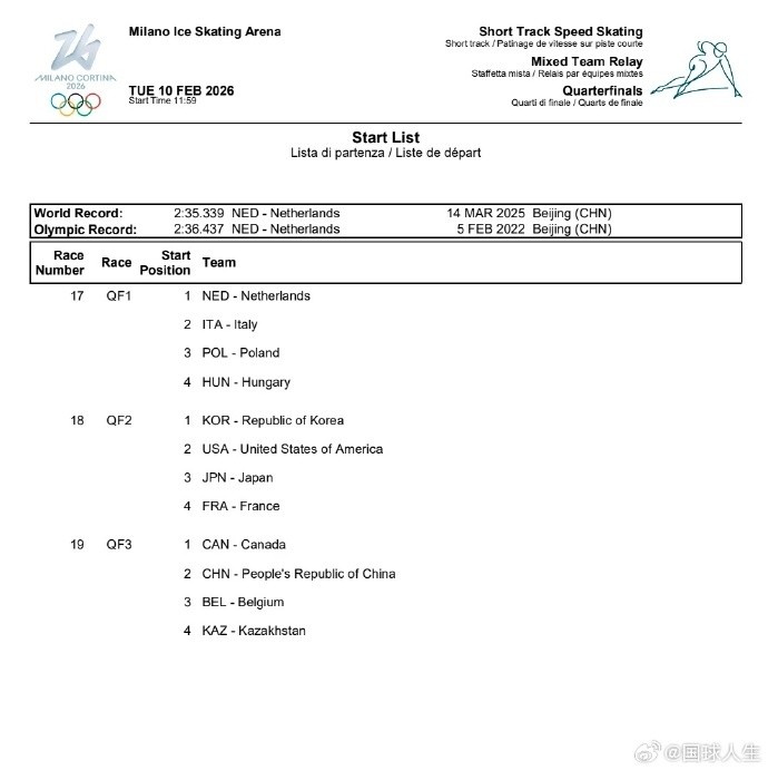 直播吧2月9日讯2026米兰冬奥会短道速滑混合接力四分之一决赛分组确认,中国和加拿大、比利时、哈萨克斯坦一同分在第三组。