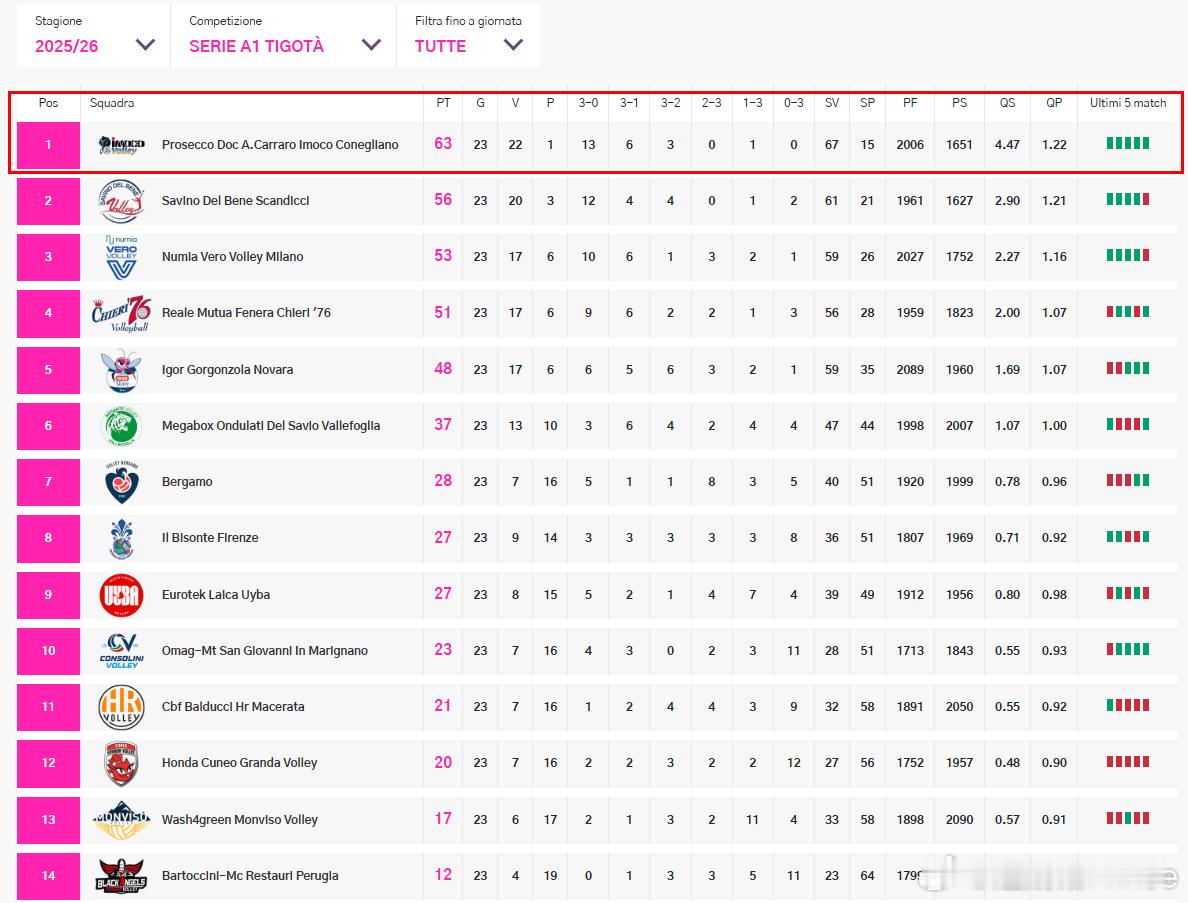 朱婷留洋第七季 ⚔️ 意甲女排联赛第23轮战罢,目前各队的积分排名👇。如没有意外结果产生(以弱胜强),科内利亚诺在本轮零封斯坎迪奇后(常规赛最后三轮对手:佛罗伦萨、佩鲁贾、蒙维索),已基本锁定常规赛冠军并获得26-27赛季欧冠联赛资格。加油!