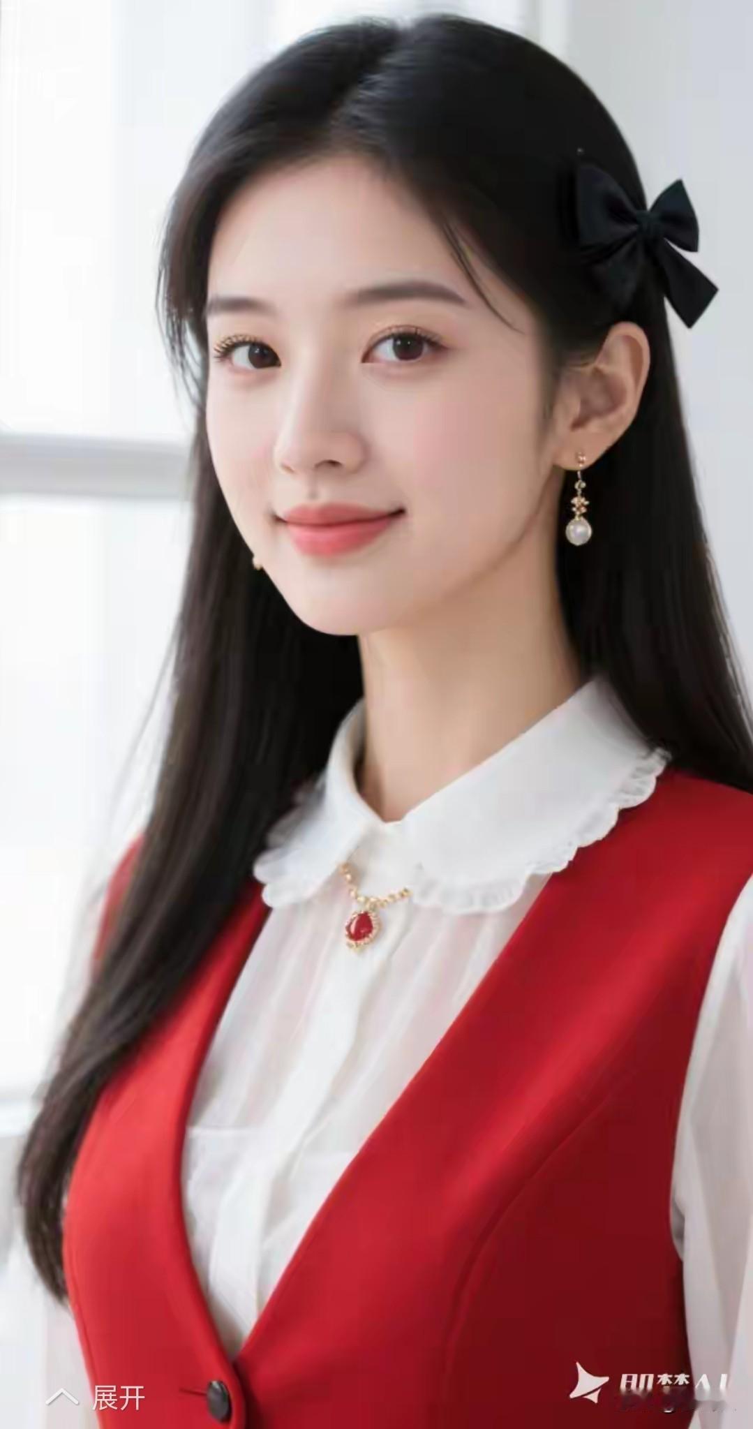 出水芙蓉,亭亭玉立。 明眸皓齿,美若冠玉。 红色背心,搭白衬衫。 黑蝴蝶结,笑容清甜。 尽显温柔,少女纯真。 国色天香,国色天香。