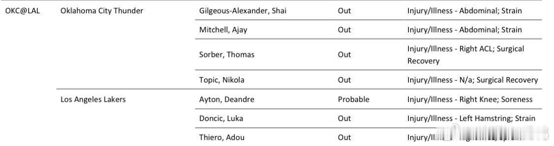 雷霆这边——杰威(右腿筋拉伤)出战成疑!亚历山大(腹部拉伤)、米切尔(腹部拉伤)、托皮奇(睾丸手术)和索伯(ACL撕裂)明日缺席!