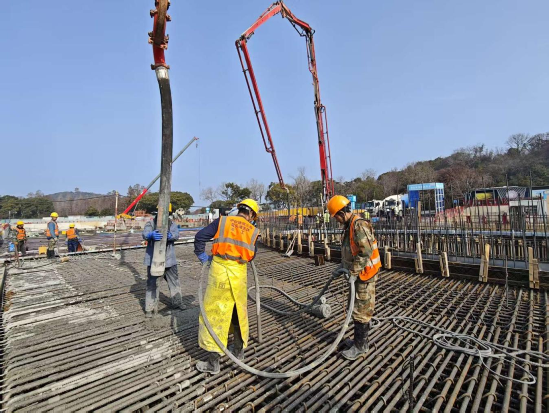 上午8时,冬寒未散,位于鼋头渚景区大门外鼋渚路上的地铁5号线施工现场一片火热,汽车吊高举吊臂,源源不断的混凝土浆从泵车喷嘴处灌进顶板钢箱梁,巨幅顶板上方,100多名建设者忙碌着。