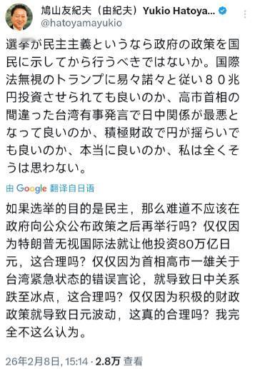 日本前首相鸠山由纪夫2月8日写道:“如果选举真的是民主的体现,难道不应该在向国民明确政府政策之后再进行吗?我们真的可以默许政府在无视国际法的特朗普面前唯命是从,白白投入80万亿日元吗?真的能接受高市首相在台湾问题上的错误言论,让日中关系恶化到谷底吗?真的可以任由积极财政政策导致日元汇率动荡不安吗?真的可以吗?我绝不这么认为。” 鸠山由纪夫的这一连串质问,没有任何华丽的说法,全是大白话,却句句戳中了当下日本政坛的毛病,也说到了日本老百姓的烦心事。 现在的日本政坛,到处都是右翼分子,讨好美国成了风气,对华强硬反而成了政治正确,没人敢说真话,没人敢反对这种错误的做法,而鸠山由纪夫敢站出来,说的都是实在话,都是为了日本的国家利益,为了日本老百姓的日子,这种理性的声音,在现在的日本政坛,真的太少太少了,特别难得。 鸠山首先质问的,就是日本政府盲目听从特朗普,白白投入80万亿日元的事。这件事是真实存在的,根据日本和美国之前达成的协议,日本要对美国投资约80万亿日元,这笔钱可不是小数目,都是日本纳税人的血汗钱。 为了凑这笔钱,日本政府甚至要发行大规模的特别国债,加重财政负担。 要知道,日本老百姓现在日子并不好过,养老金、医疗保险、教育等民生福利都面临压力,这笔80万亿日元,本来可以用在老百姓身上,改善大家的生活,可政府却不管不顾,一味听从特朗普的安排,把钱白白花在了讨好美国上,这种做法,难怪鸠山要强烈反对,换做任何一个有良知的日本人,都会觉得不妥。 紧接着,鸠山质问的就是高市首相在台湾问题上的错误言论。高市早苗上台之后,多次在台湾问题上说糊涂话,她曾在国会答辩时称,一旦台湾发生危机,就构成日本可行使集体自卫权的“存亡危机事态”,这种说法完全是错误的,也是在干涉中国的内政。 要知道,根据1972年的《中日联合声明》,日本政府明确承认台湾是中国领土不可分割的一部分,可高市却公然违背这一承诺,说这种错误的话,直接导致日中关系越来越差。 中方也多次严厉驳斥高市的言论,指出她的做法暴露了日本右翼势力的野心,对地区和平稳定造成了严重威胁。 鸠山由纪夫早就批评过高市的这种言论,他强调,台湾问题纯属中国内政,日本不应该插手,现在他再次质问政府,就是不想看到日中关系继续恶化,因为日中关系不好,最终受害的还是日本老百姓,比如日本的农产品出口、旅游业都会受到影响,很多日本人都会因此丢了工作。 鸠山还质问政府,为什么要任由积极财政政策导致日元汇率动荡不安。高市政府上台之后,推出了大规模的经济刺激方案,说白了就是乱花钱,这种做法直接导致了日元持续贬值,就算日本央行加息,也没能阻止日元下跌。 现在日元越来越不值钱,带来的麻烦也越来越多,首先就是物价上涨,日本是资源贫瘠的国家,很多能源和资源都需要进口,日元贬值之后,进口成本大幅上升,这些成本最终都会转嫁到老百姓身上,大家买东西越来越贵,手里的养老金也跟着缩水。 另外,日元贬值还导致很多日本中小企业经营困难,因为他们的进口成本增加,却很难把成本转嫁出去,不少企业都面临倒闭的风险。 德意志银行也曾警告过,高市的财政计划已经导致日本国债和日元汇率齐跌,有可能引发更严重的资本外逃,给日本经济带来更大的危机。 这种情况下,日本政府却不管不顾,放任日元动荡,难怪鸠山会发出强烈的质问。 现在的日本政坛,右翼势力越来越猖狂,政治也越来越极端化。高市作为右翼保守势力的代表,上台之后推动了一系列右倾举措,比如增加防卫费、松绑武器出口、研究限制外国人购买土地等,这些做法都很危险。 而且,现在日本社会对不同观点的容忍度越来越低,只要有人质疑高市的政策,就会遭到恶意攻击,比如早稻田大学的名誉教授,仅仅因为质疑高市的支持率,就遭到了大量恶意留言;一名日本主持人,仅仅因为指出“最先挑起争端的或许是日方”,就遭遇了网络围攻。 在这种情况下,鸠山由纪夫还敢站出来,公开质问政府的错误做法,坚守常识,尊重国际法,真正为日本的国家利益和老百姓着想,这种理性的声音,真的太难得的。 鸠山由纪夫的这一连串质问,没有任何虚的,全是实实在在的问题,每一个问题都戳中了日本政坛的毛病,也说到了老百姓的痛点。 他不是在故意挑事,而是真心希望日本政府能清醒过来,停止盲从特朗普、停止乱花钱、停止在台湾问题上玩火、停止放任日元动荡,真正为日本的国家利益着想,为老百姓的日子着想。