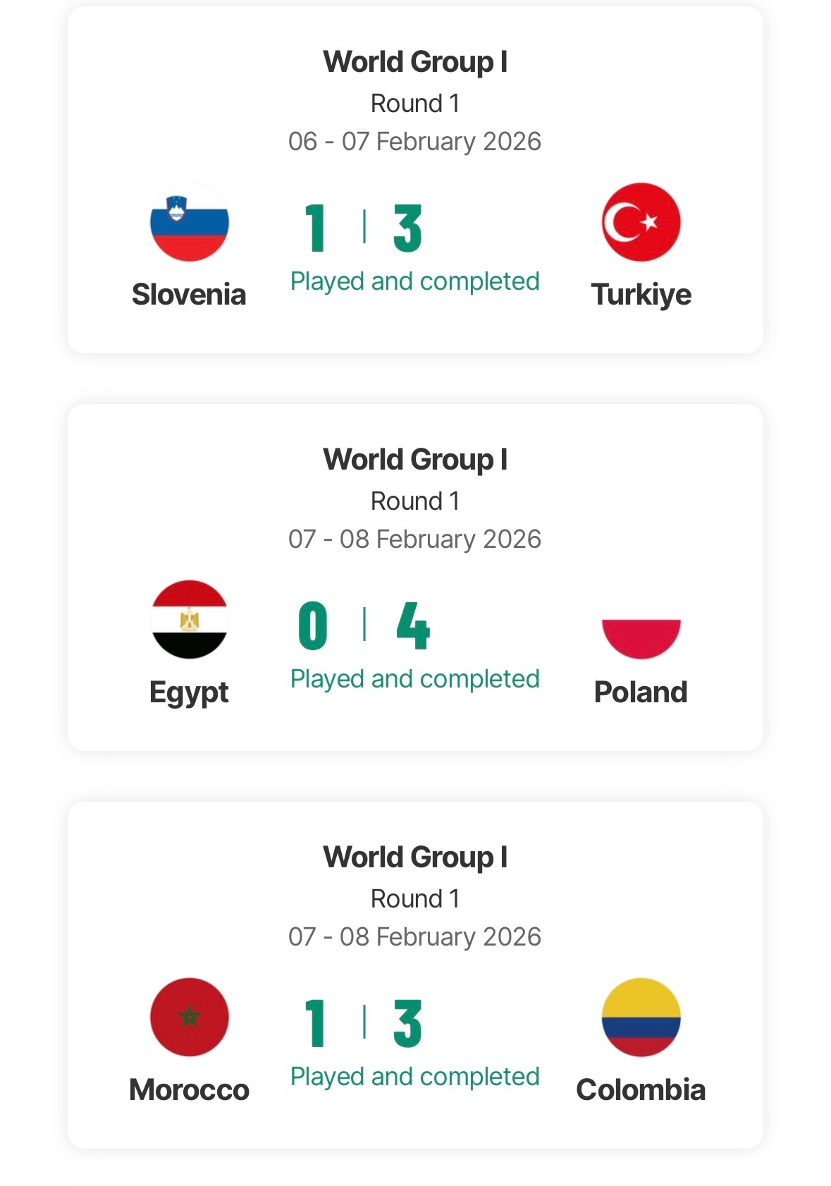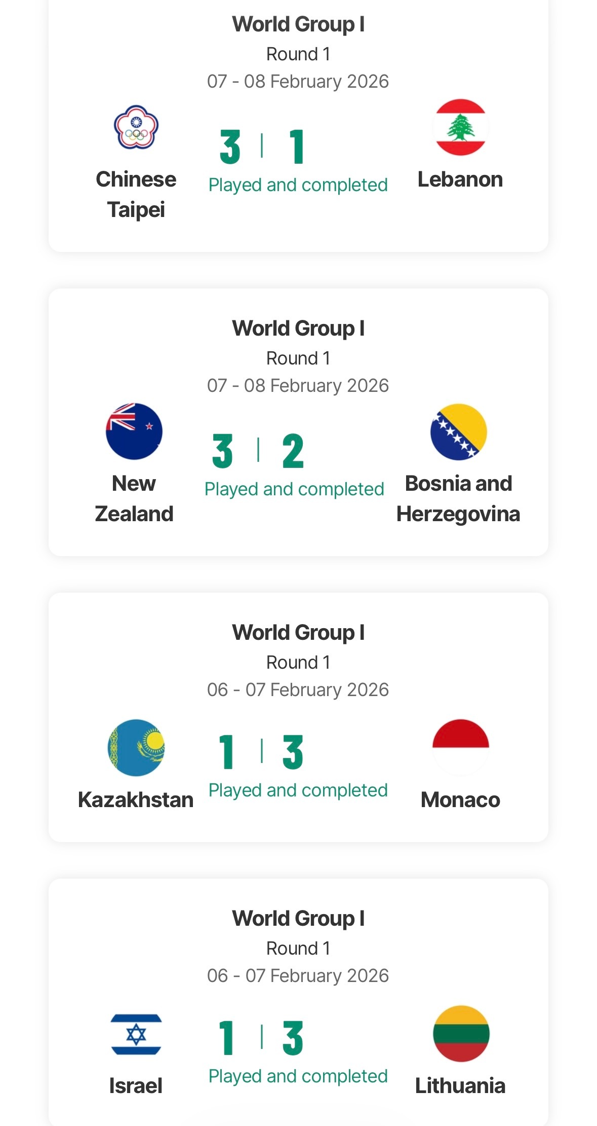 2026戴维斯杯世界1️⃣组附加赛全部赛果: