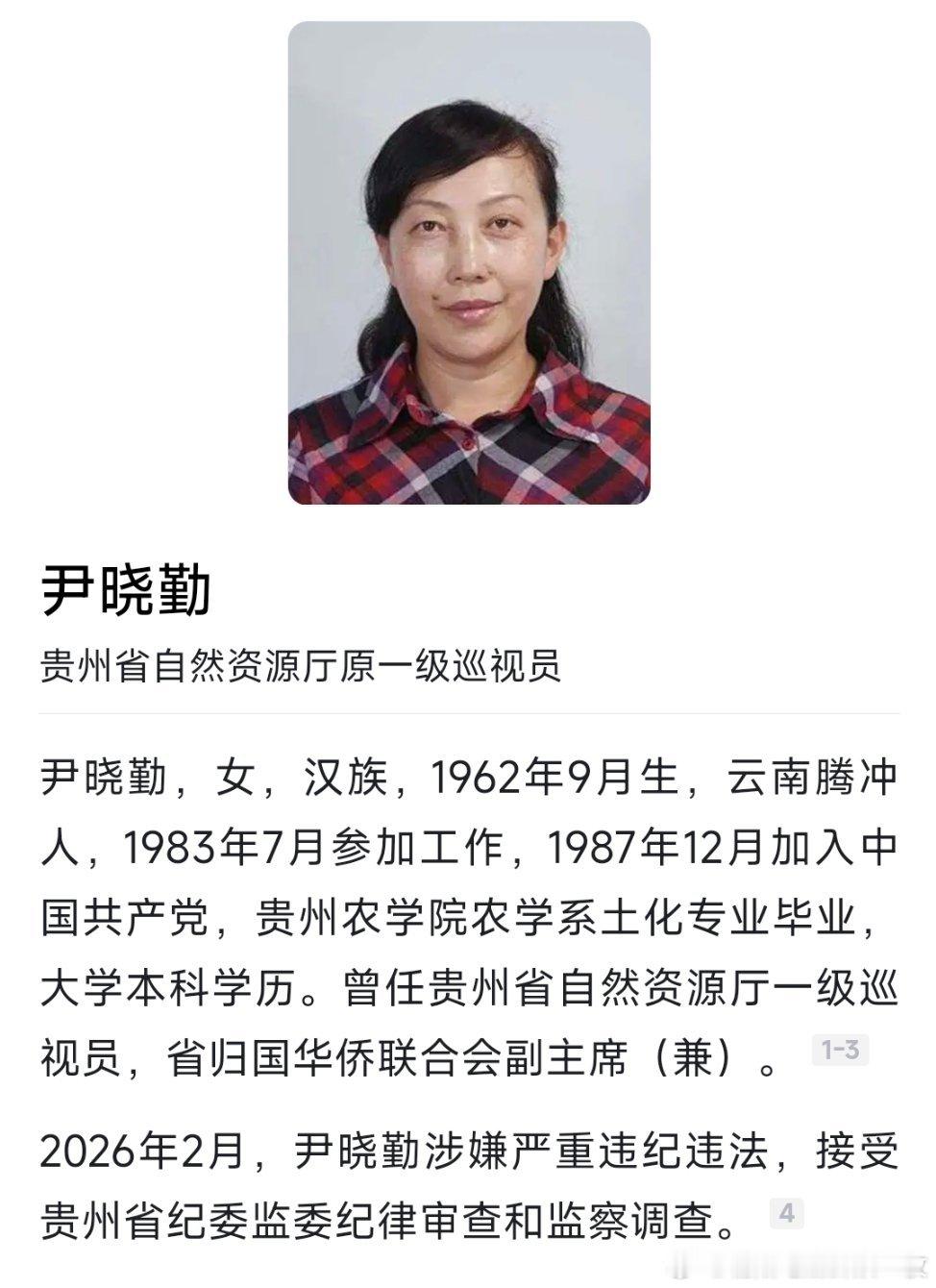 贵州省自然资源厅原一级巡视员尹晓勤接受纪律审查和监察调查。