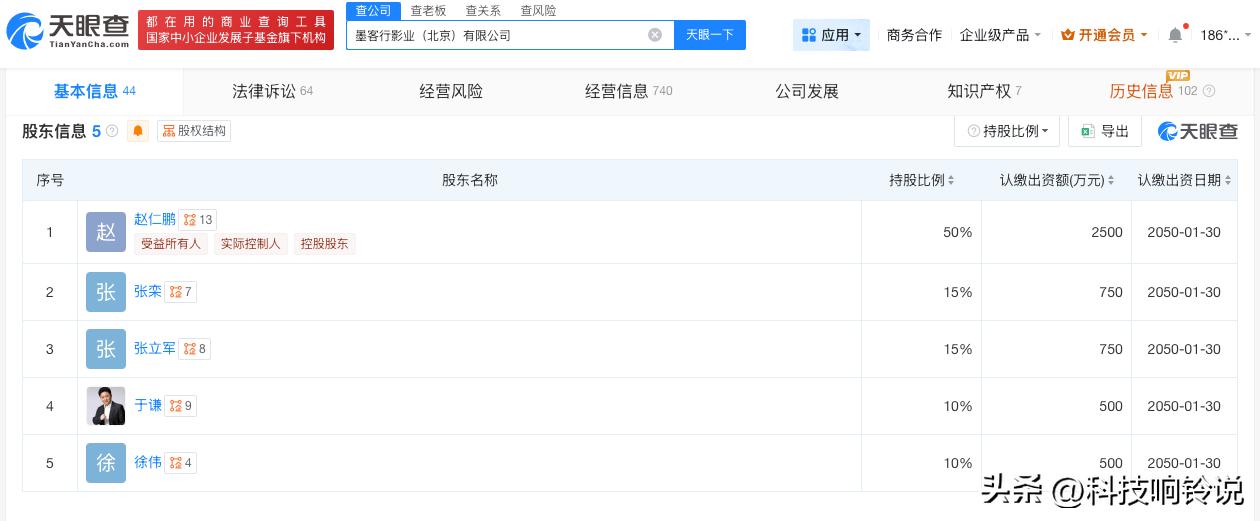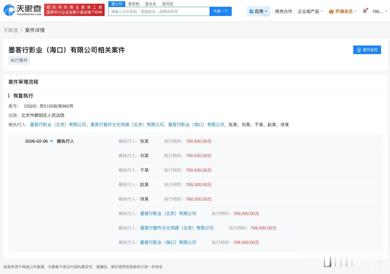 【于谦被恢复执行 于谦被恢复执行76万】 天眼查天眼风险信息显示,近日,于谦、墨客行影业(北京)有限公司等新增一则恢复执行信息,执行标的76.95万元,执行法院为北京市朝阳区人民法院。 墨客行影业(北京)有限公司成立于2019年1月,法定代表人为赵仁鹏,注册资本5000万人民币,经营范围含电影摄制、组织文化艺术交流活动、影视策划等。股东信息显示,该公司由赵仁鹏、张栾、于谦等共同持股,其中于谦持股10%。 天眼查信息: