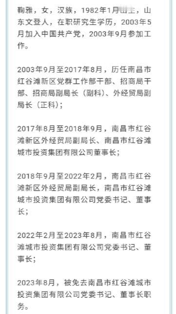 刚看到新闻,前红谷滩城投董事长鞠雅在狱中穿着囚服痛哭:“妈,我对不起你!”那个贪污4900万的她,如今面容憔悴,神采全无,简直认不出是曾经风光无限的领导。 记得她22岁从四川大学毕业,通过选调进入南昌红谷滩新区,一路顺风顺水。26岁就当上副科,35岁提拔为城投董事长,手里权力大了,一切都变了。她开始干预项目招标,从接受宴请、收钱到主动伸手,甚至明码标价。 最大的一笔,一次就收了950万,据说是某个工程签约后,直接打到了她亲属的账户上。短短几年,受贿累积到4900万,她早忘了自己还是“省优秀三八红旗手”,更忘了母亲从小教导的诚实做人。直到41岁,她主动交代问题,但前途尽毁,黄金年华沦为阶下囚。 现在一想到她母亲曾以她为傲,我就觉得心酸又后怕。职场里,权利诱惑下,一步错步步错。你们身边有这种从巅峰跌落的例子吗?