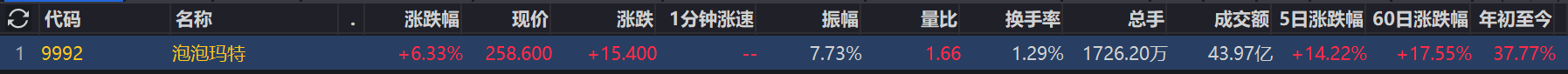 泡泡玛特日内一度涨超8%,截止发稿,涨超6%。