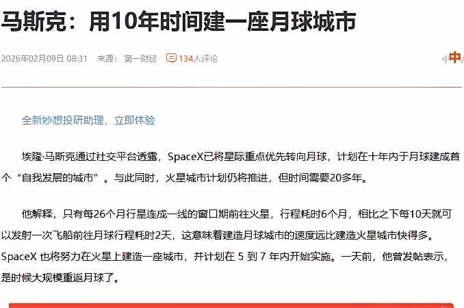 马斯克放话:10年建月球城!别笑他画饼,这是全球航天加速的发令枪有人说马斯克只会