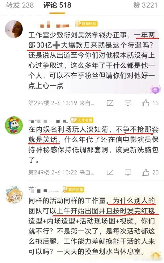 刘昊然粉丝手撕工作室!刘昊然粉丝觉得刘昊然一年手握两部30亿+票房的电影,去了微博之夜竟然只能做边缘的座位,与实绩咖位不符合,要求工作室重视刘昊然的活动咖位,加强对刘昊然个人和角色的营销,看了下刘昊然的座位,在二排左区,粉丝可能想让他去中区,但中区除了王一博年轻都偏大,左区还挺好的,基本都是电影咖和实力派演员和歌手,中区夹杂了一些实绩确实不如刘昊然的高流量艺人。