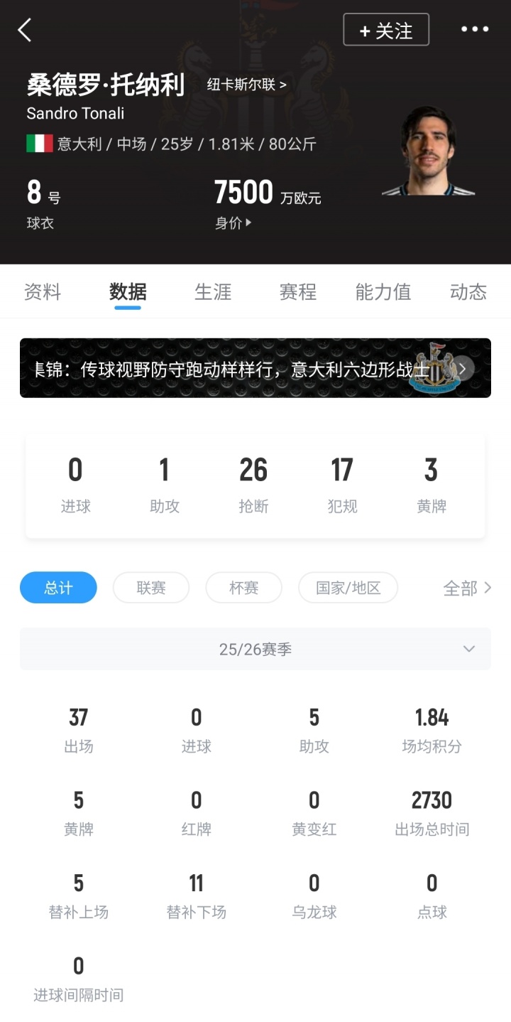 托纳利2023年夏窗以6080万欧转会费从米兰加盟纽卡,目前已为球队出战94场比赛,贡献7球8助,德转身价7500万欧。