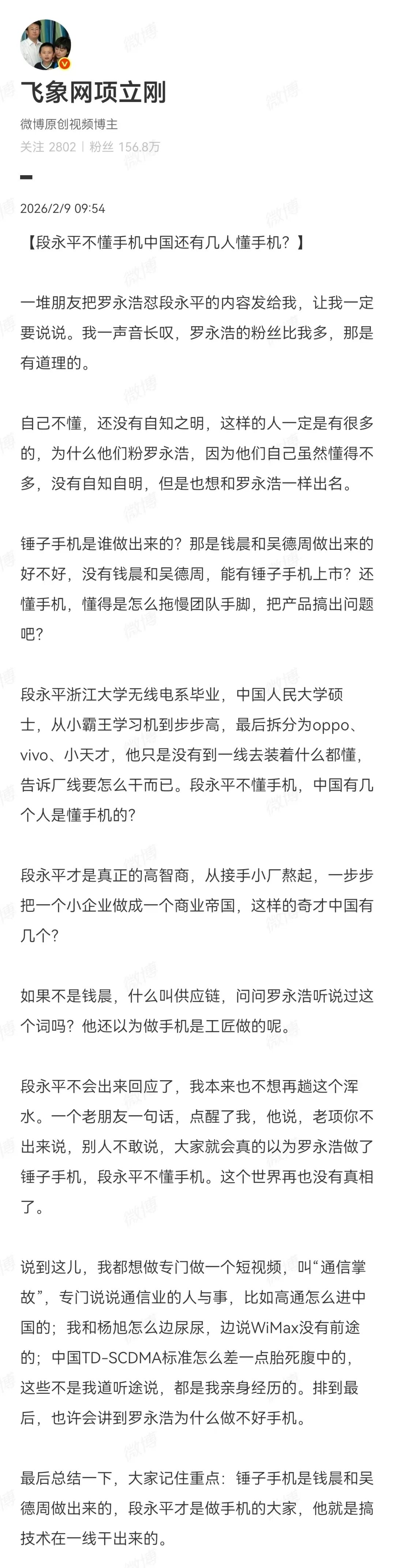 今日,项立刚转发罗永浩评论,以《段永平不懂手机中国还有几人懂手机?》为题发文回应。