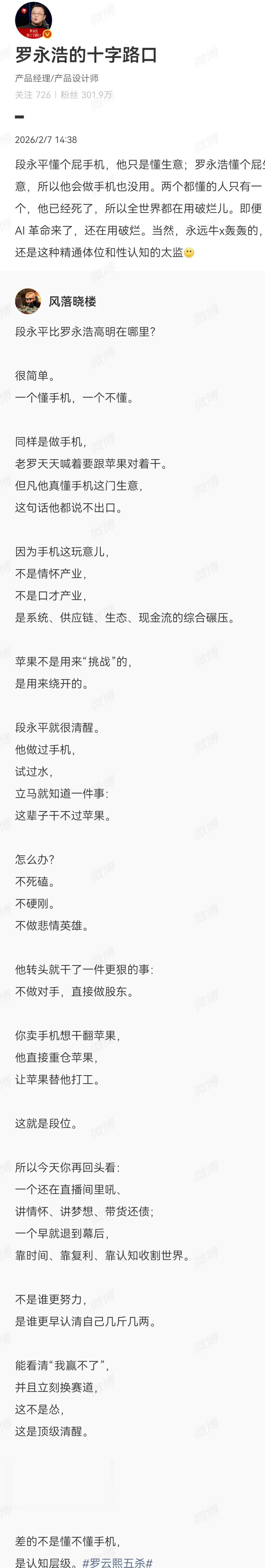 此事起因是,2月6日,一名网友发微博,将段永平与罗永浩进行对比。该网友认为,段永平比罗永浩“高明”之处在于“一个懂手机,一个不懂”。文章指出,罗永浩做手机时“天天喊着要跟苹果对着干”,而段永平则“很清醒”,在尝试过手机业务后意识到“这辈子干不过苹果”,于是选择“不做对手,直接做股东”,通过重仓苹果股票实现资本收益。该网友总结称,二人差距在于“认知层级”,一个是“创业者段位”,一个是“资本段位”。