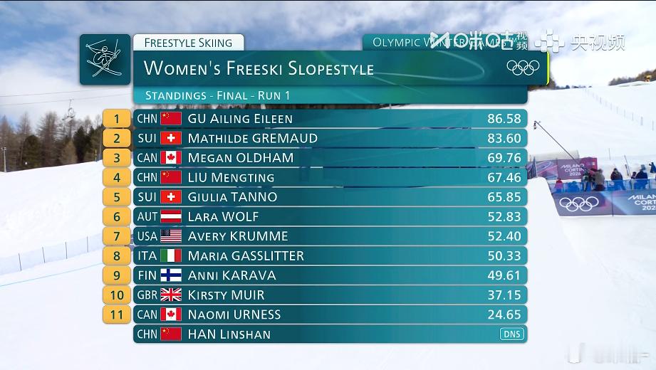 谷爱凌决赛断层领先!!!谷爱凌86.58分直接冲上第一,领先2、3名小20分!!第一轮,谷爱凌第一!上届冠军落后咱3分~还有2轮,稳住!!!