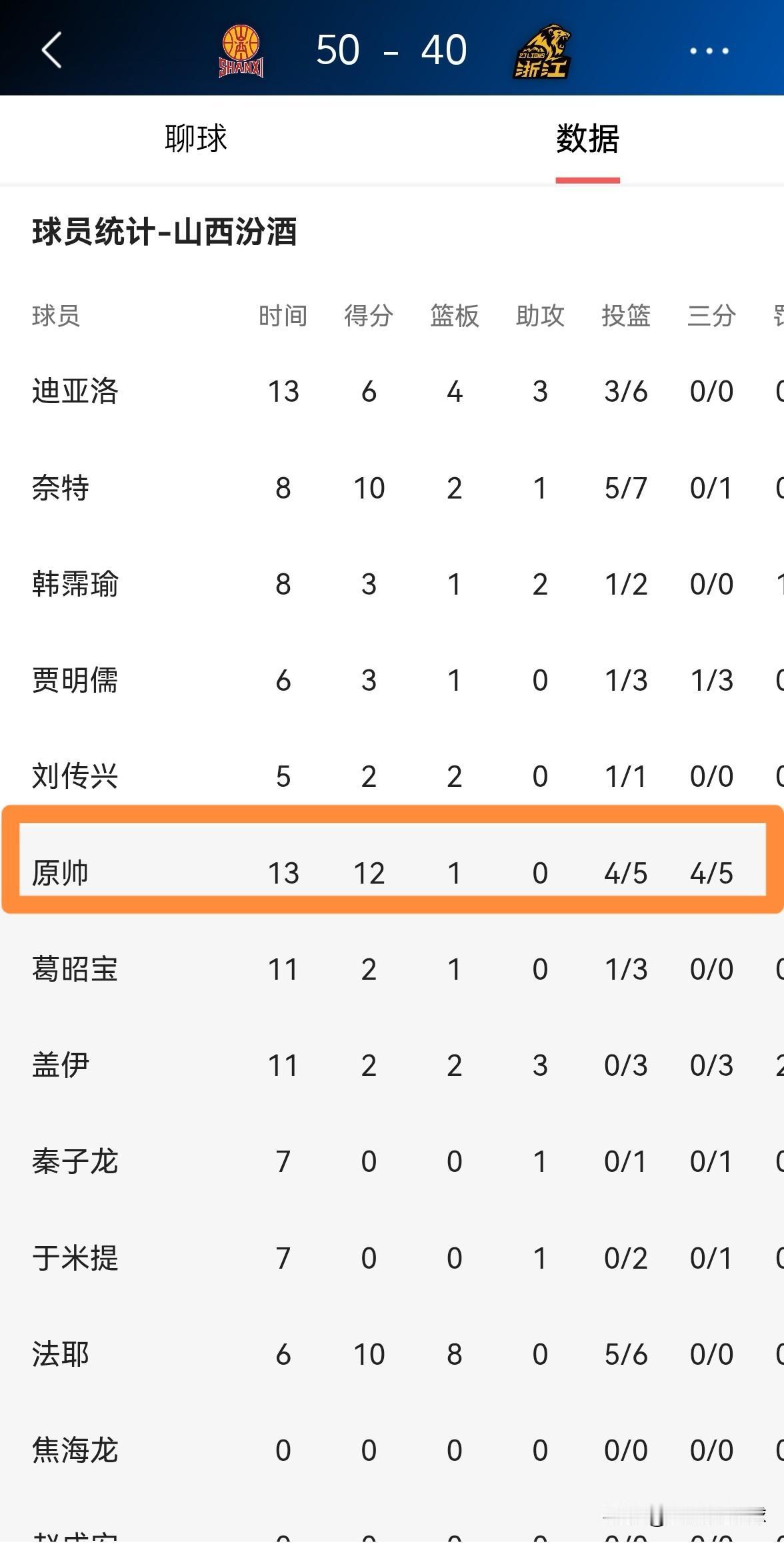 山西汾酒神射手原帅真是投疯了!在今天进行的山西汾酒和浙江方兴渡的CBA俱乐部杯半决赛中,目前两队的上半场比赛已经结束,山西汾酒以50:40领先对手10分。在前两节比赛中,原帅在三分线外如有神助,他在替补出战的13分钟里,三分球5中4极其高效的砍下12分,还有1篮板,没有出现任何的失误和犯规,他的场上正负值为+6。 坦白说,只要原帅能够在下半场比赛中延续自己的火热手感,那么山西汾酒必胜无疑。