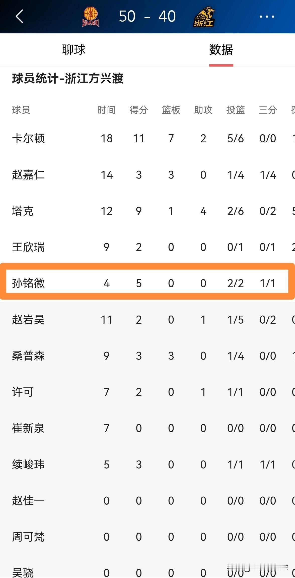 浙江方兴渡超级后卫孙铭徽真是太可惜了!在今天进行的浙江方兴渡和山西汾酒的CBA俱乐部杯半决赛中,目前双方半场战罢,浙江方兴渡以40:50落后于对手。让人感到非常可惜的是,在前两节比赛中,孙铭徽因伤仅仅首发出战4分钟,投篮2中2,其中三分球1中1得到5分。 老实说,如果孙铭徽没有因伤提前退赛的话,我相信浙江方兴渡完全有机会赢下本场比赛,如今随着孙铭徽的伤退,浙江方兴渡恐怕很难获胜了。