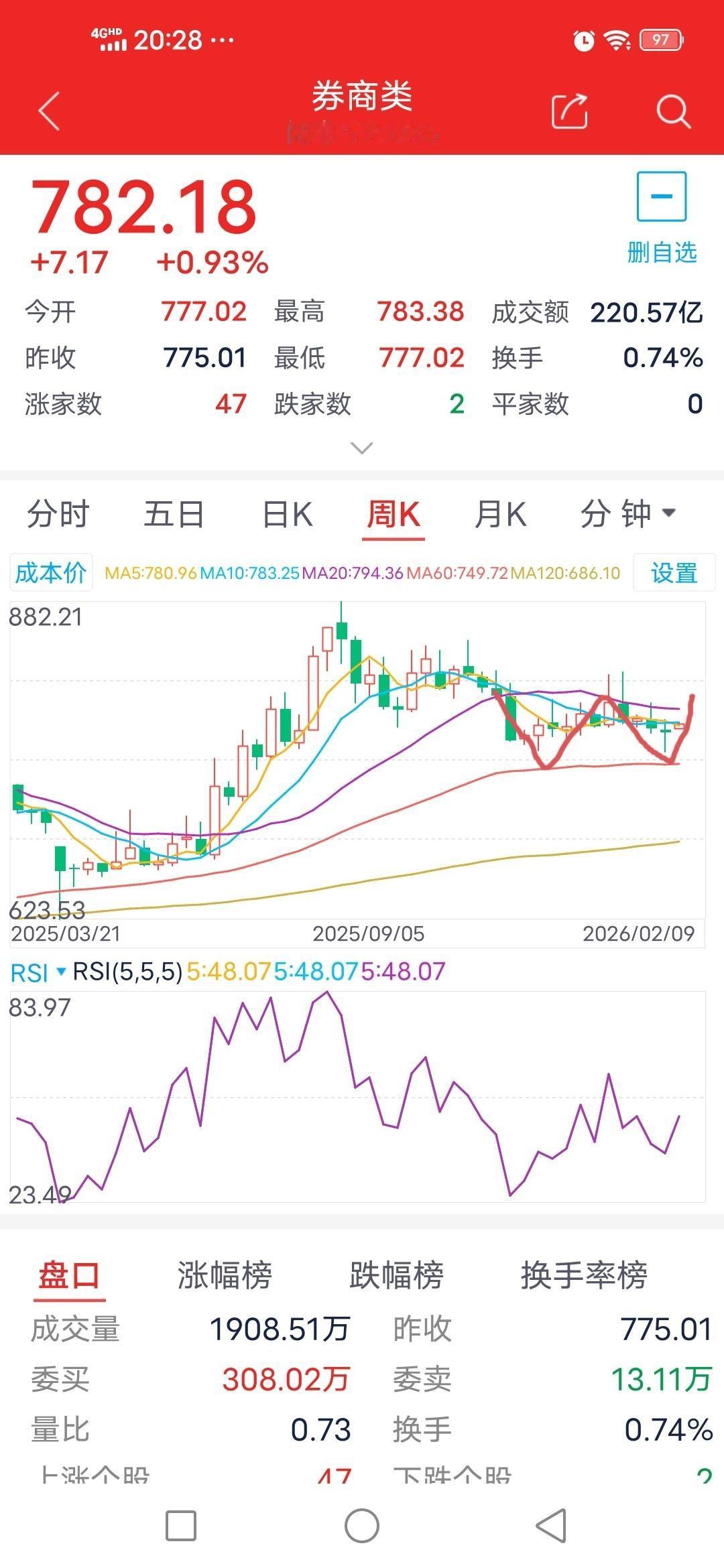 老乡别走?2月10日券商板块走势预测。 今天券商板块开盘跳空高开报777.02点,这也是今天的最低点,最高涨至783.38点,最终收于782.18点,涨幅为0.93%,成交量微幅缩减。 从60分钟级别昨天说到“指数有望在770点~786点区间内来回震荡”。今天走势基本符合预期,全天运行在774点和786点之间,今天已经站上了5日、10日和60日线,从布林线分析,明天预计会向上冲击一下上轨788点或120天线,大概率还是会冲高回落。 从日线级别来讲,今天成功站上5日均线和10日均线,但仍然受制于20日线和60日线,明天重点关注能否突破这两条均线的压力,如果能有效突破,那么日线级别还可以继续保持向上趋势。 从周线级别来看,目前有形成双底结构的可能,但是近期一直受制于5周线和10周线的压力,在没有突破之前,周线级别还处于空头形态。 综合分析,明日向上看20日线和60日线能不能突破,如果突破了则压力位为788点和793点。向下首先看5日线的支撑力度,然后就是774点。