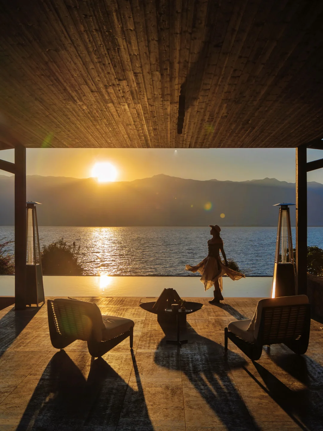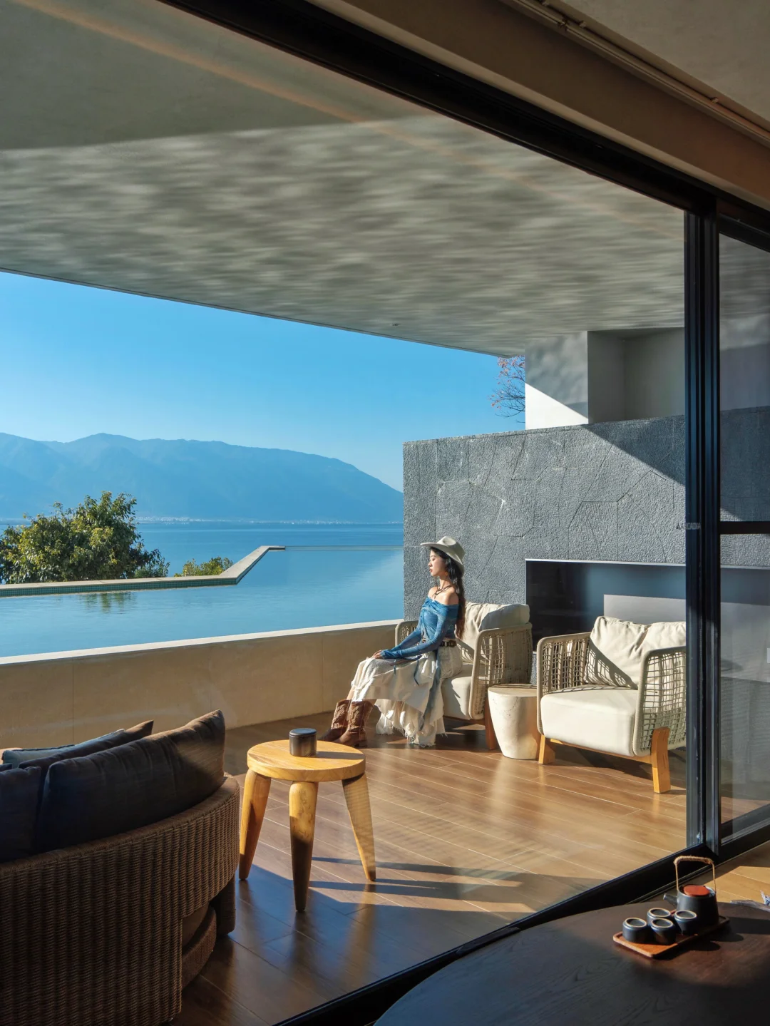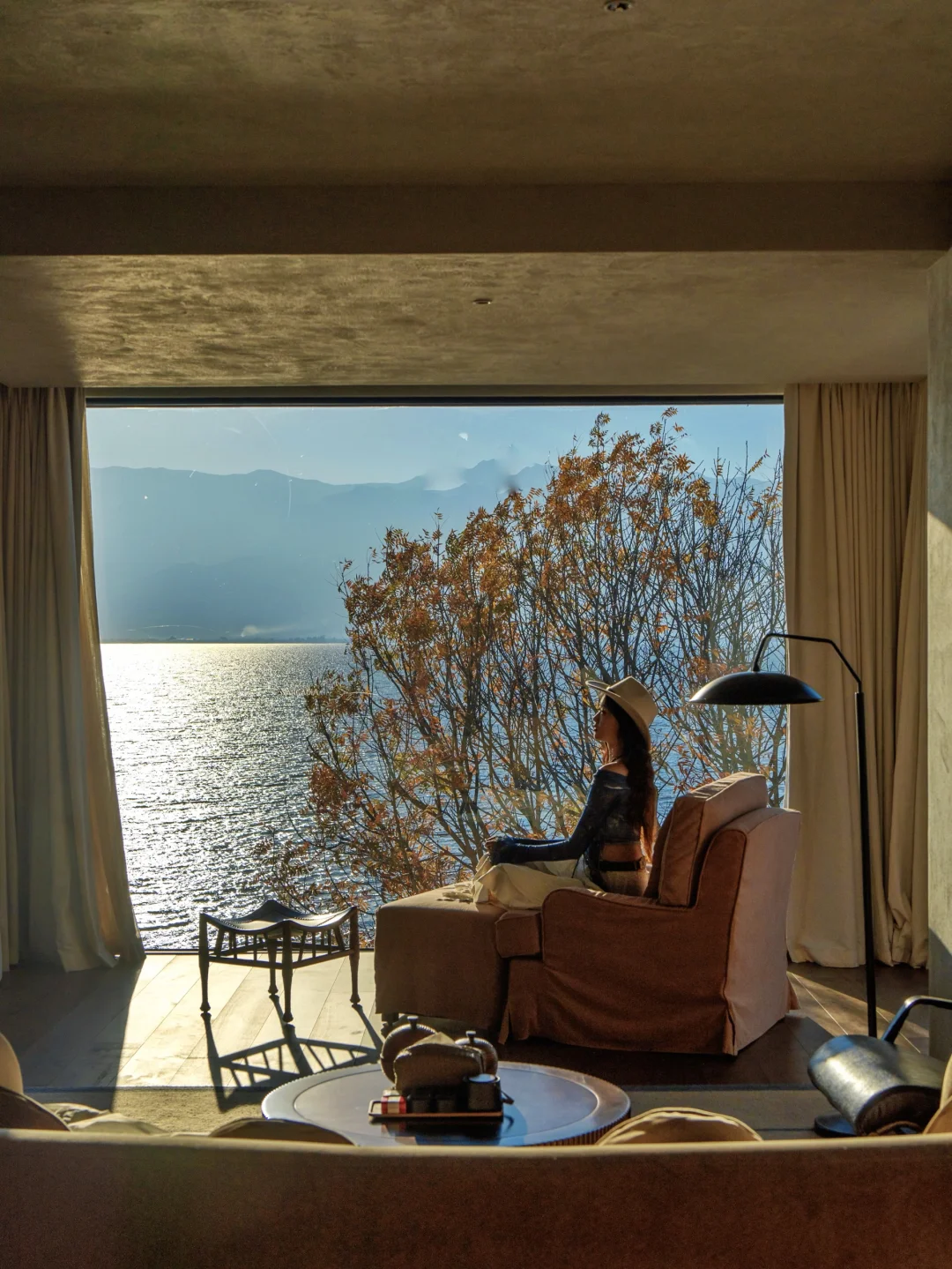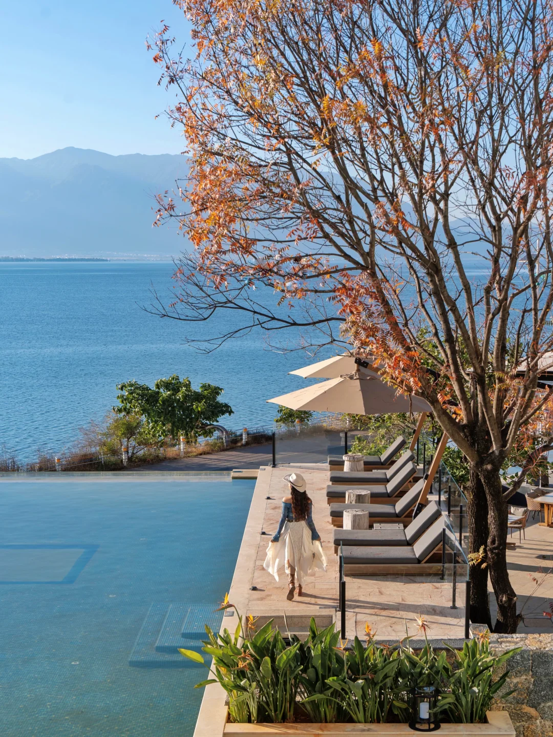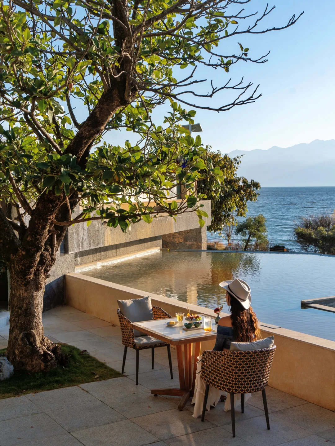 3️⃣大理住宿可以考虑住在双廊或者古城,双廊是临海的,躺着就能看到海,下午茶坐在泳池边吃边晒太阳好舒服,蓝调时分提灯站在泳池边,拍照好好看~