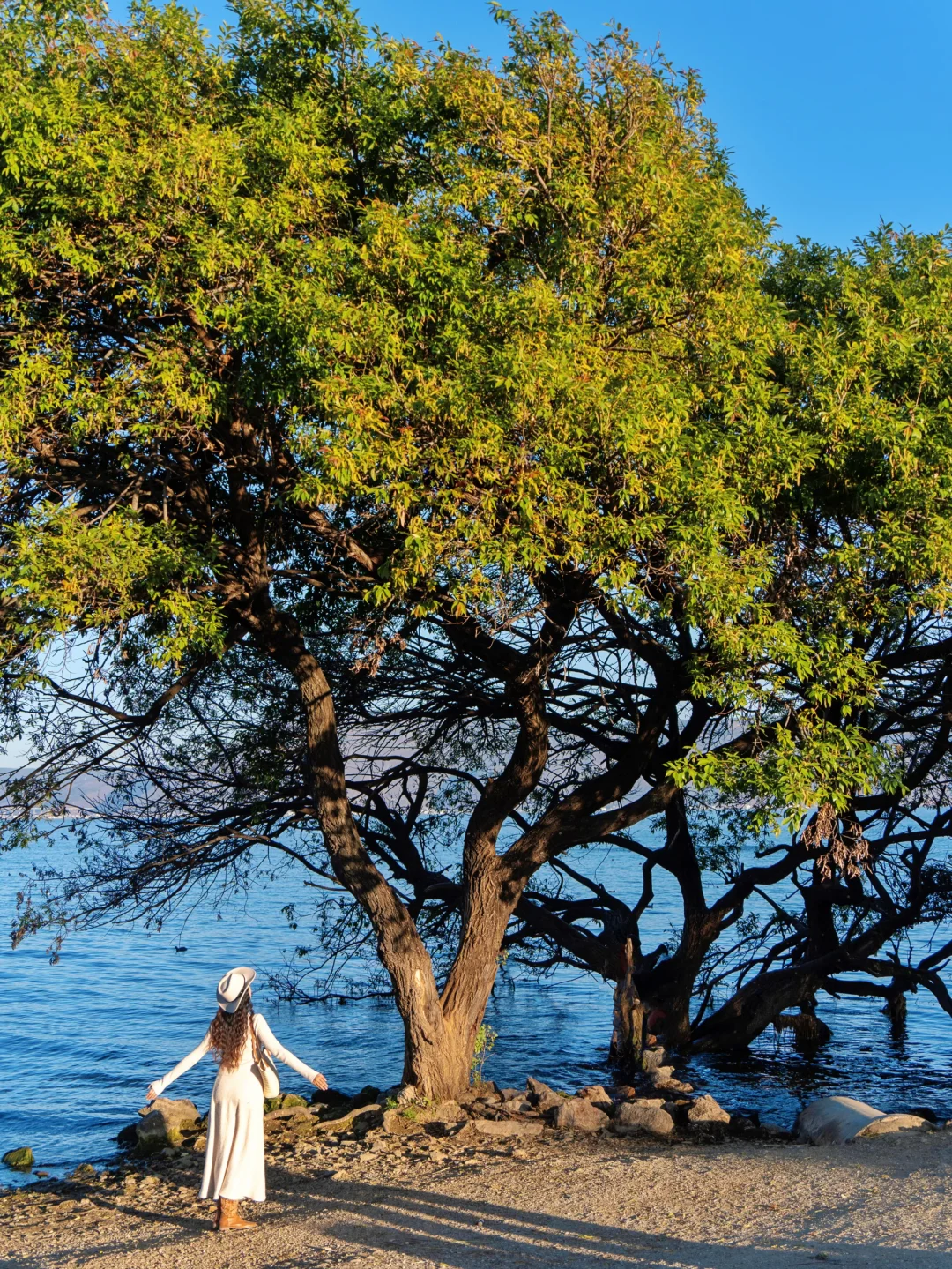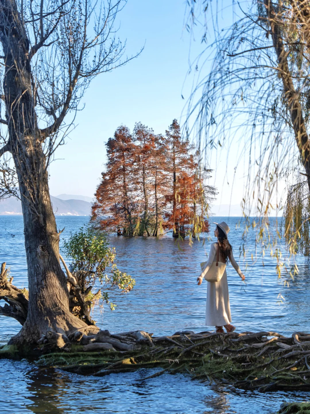 人站在孤独大树的边上,背后能看到洱海,蓝色的洱海好美