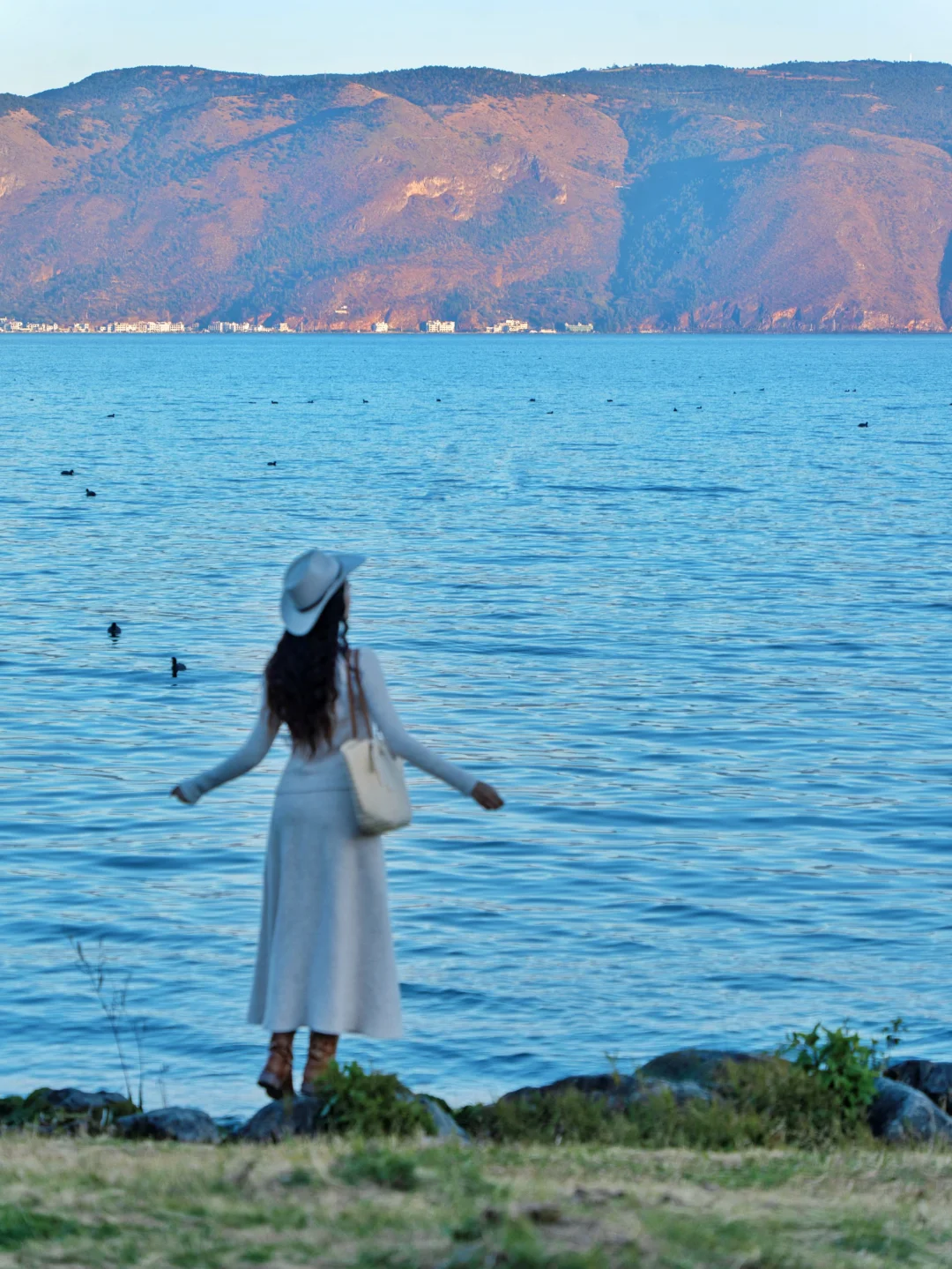站在洱海边,对面是被太阳照亮的海东和双廊,橘粉色好美,洱海是湛蓝色的