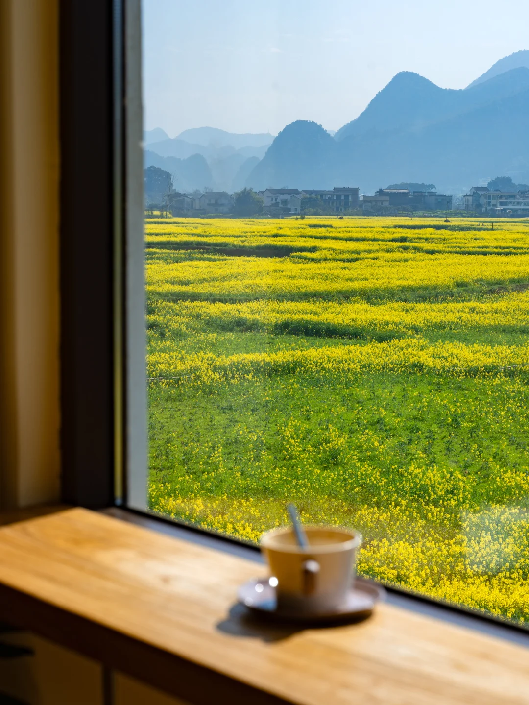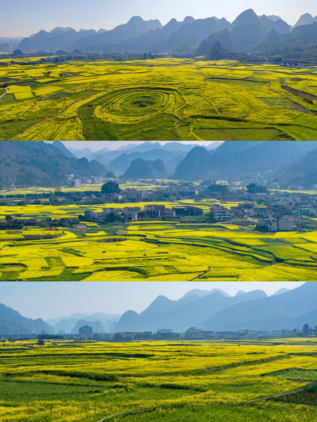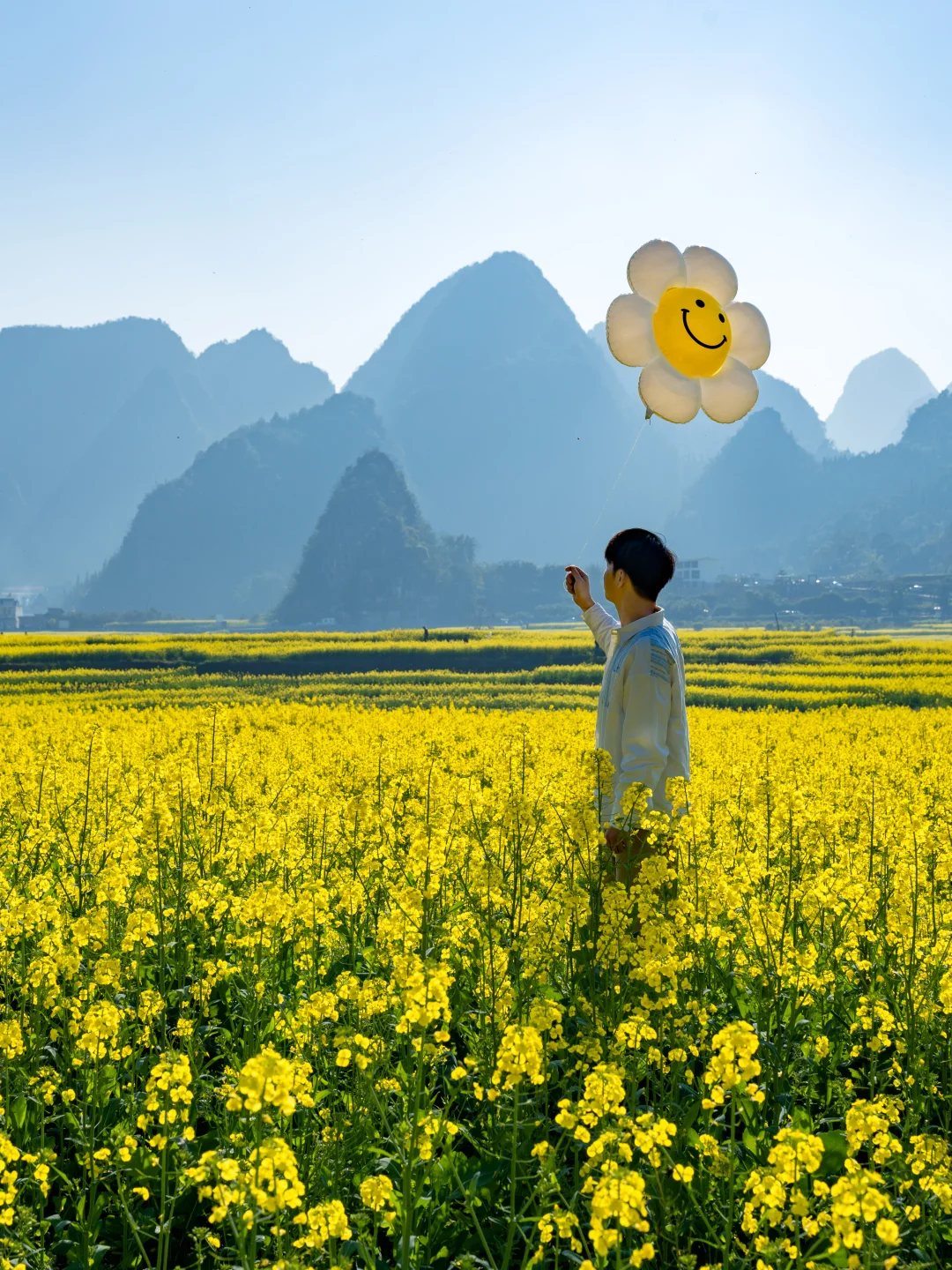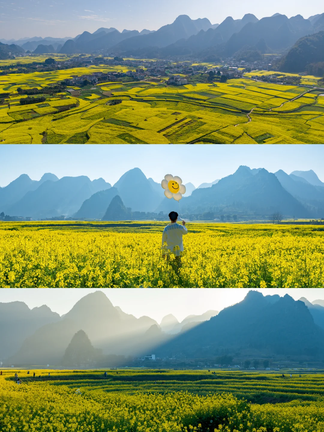 当喀斯特峰林披上金色花毯,2月的万峰林就是上帝打翻的调色盘。作为刚踩点回来的摄影党,这份2026年最早的油菜花拍摄攻略请收好~ 📍地点:贵州兴义万峰林景区 ✈️飞机:直飞兴义万峰林机场 🚇高铁:直达兴义南站 🎫门票:观光车+门票 110元 ✅打卡油菜花 ❶八卦田观景台:俯拍天然太极八卦图腾,无人机正上方视角最震撼,晨雾未散时像水墨画。 ❷万峰林有许多村咖,找个视野好的咖啡馆,惬意的呆一下午,欣赏这片油菜花海。 ❸田间栈道:低角度仰拍让峰林与花海同框,蹲在田埂拍人物转身瞬间,裙摆与金浪同频。 ❹喜欢拍人像可体验一下油菜花妆,合壹茶室民宿的油菜花茶也非常值得品尝一下。 ✅关于拍照 ❶花期在12月—3月初,盛花期在2月春节前后。 ❷上午9-11:00光线柔和不逆光,适合拍花海全景; ❸下午16-17:00夕阳为花田镀上暖金,逆光拍出氛围感大片。 ❹想拍晨雾的狠人,6点入园能承包无人花海。(注意看天气,温差大的时日才有机会拍到) ✅Tips ❶穿搭避开黄色系,白色/淡蓝长裙最出片。 ❷观光车50元/人,核心景点间移动建议租电动车。 ❸无人机需提前报备,限高120米。