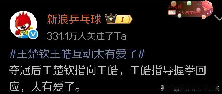 乒乓球亚洲杯的比赛已经结束一天了,但是最后的压轴大戏,也就是王楚钦和张本智和之间的男单争冠战,却依然让球迷。们热议不断,甚至是津津乐道。最让人兴奋的其实是在比赛结束之后,也就是王楚钦4:2战胜张本智和,拿到男单冠军之后,他和主教练王皓之间的友爱互动。 当时王楚钦是直接指着王皓指导来表达自己那份开心和快乐的情绪,而王皓指导则握紧拳头向王楚钦 致意,这对师徒也用这样的一种方式证明了王楚钦的王者归来。 的确,全运会上输给樊振东,而且还是不止一次输给樊振东,让王楚钦也一度受到球迷质疑,同时在世界赛场上,他因伤缺席一些关键比赛,甚至需要用退出比赛的方式来让自己结束世界赛场关键战的争夺,这的确对王楚钦在球迷当中的形象似乎产生了一些小小的负面影响。但事实上,王楚钦也是在长期疲劳作战的情况下谨慎做出的选择和决定,并不是逃避困难和挑战。 如今看来,他当初的这种选择也就是在身体有伤病而且非常疲劳的情况下,不盲目参赛,也不盲目坚持,的确对于王楚钦的状态复苏,还有整体竞争力提升带来了很大的帮助。于是我们看到了这次亚洲杯赛场上他的王者归来,包括女单赛场上孙颖莎也是同样在伤病恢复之后,上演王者归来的好戏。两个人也共同实现了从伤退到最终站上亚洲单打冠军领奖台的蜕变。 从某种程度上来说,王楚钦和王皓。和王皓指导的那种有爱互动,还有非常自信和霸气的动作交流,无疑在向外界宣告:即使国乒男队面临各种挑战,整个团队遇到的困难甚至可以说前所未有,但是对于王皓和王楚钦来说,从教练班子到队中的核心球员,都选择了直面困难和挑战,没有人选择放弃,也没有人在压力面前就此低头,他们会用自己更加出色的表现来证明,即使困难重重,即使队友们纷纷倒在主要对手的拍下提前出局,但依然可以有人坚持到最后,来捍卫国乒荣耀。 最后,我们也希望这次比赛当中王楚钦的最终夺冠还有王楚钦和王皓指导的这种友爱互动,可以帮助国乒男队在新赛季开一个好头,让他们在面对各种挑战和越来越大的竞争压力的时候,还能不断的带着自信去提升综合竞争实力,让国乒男队也能像女队那样越来越提高打关键战、困难仗的战斗力,从而依然可以在世界男子乒坛稳稳确立一个世界男乒老大的位置。我们也相信国乒男队依然具备这样的实力,而王楚钦依然可以成为值得大家放心的关键人,您觉得呢?