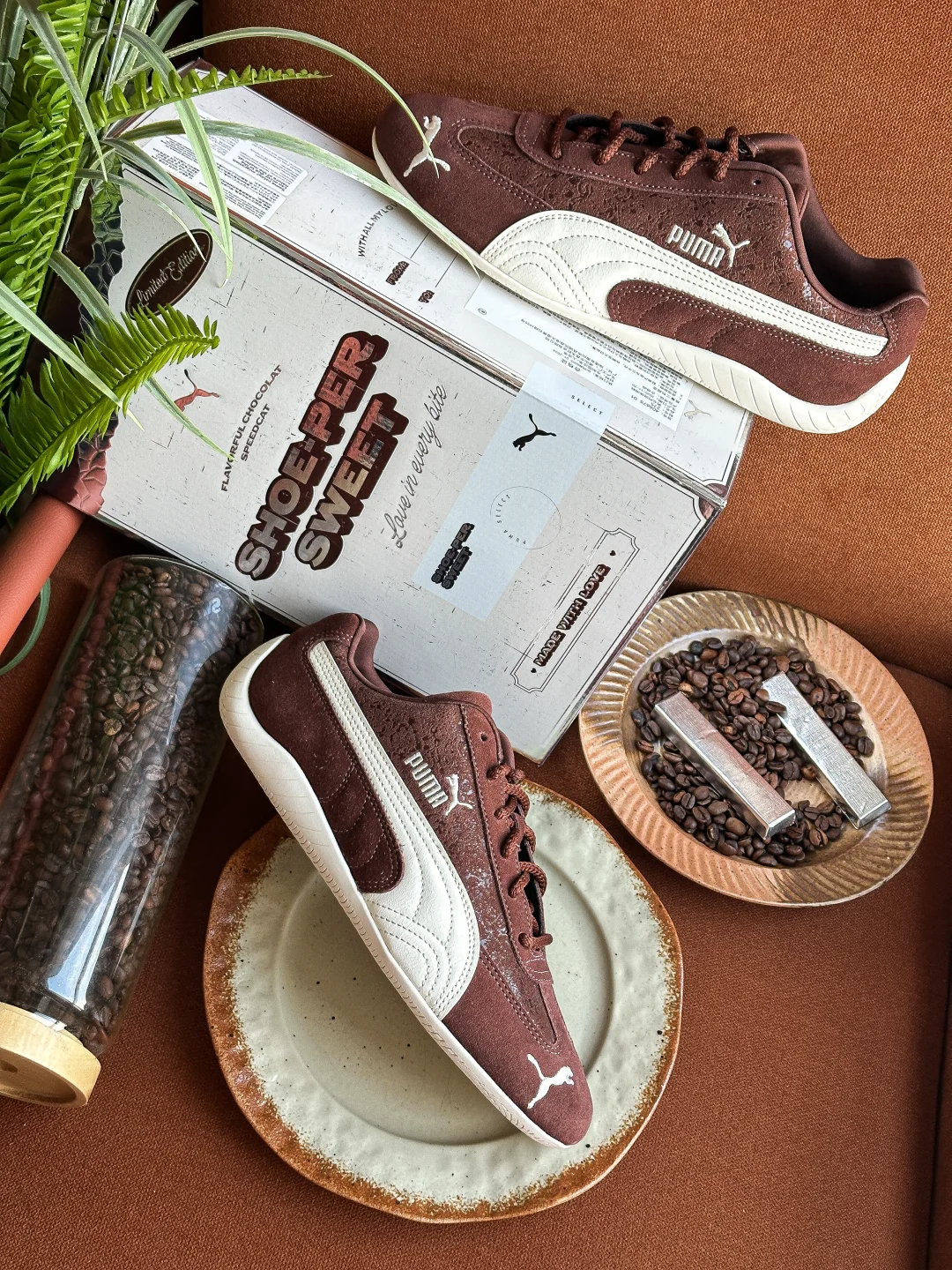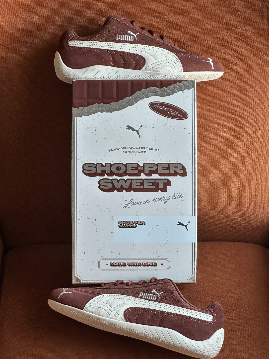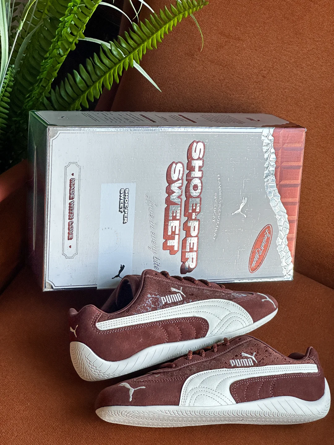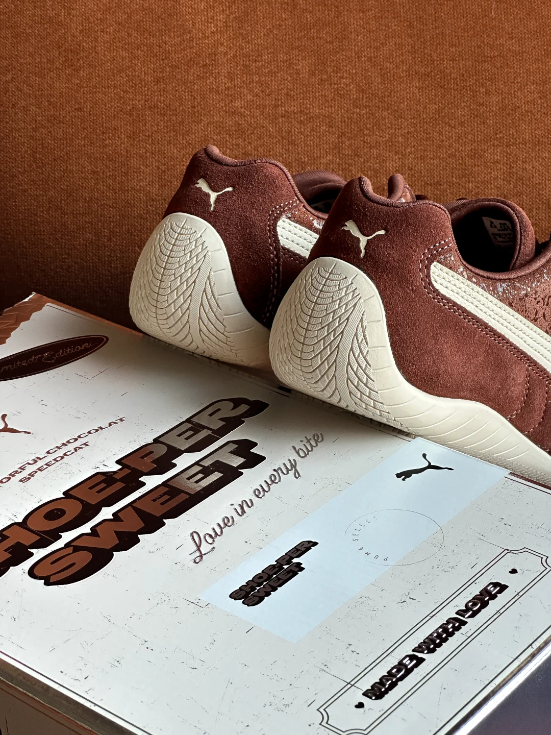 究竟巧克力味道的鞋子👟?还是鞋子形状的巧克力🍫?Puma Speedcat情人节的这一波操作也是拿捏了我。 巧克力棕色+奶白色的搭配,完美契合秋冬。 叠加特殊涂层的翻毛皮,软糯质感拉满的同时还为鞋子增加了星光点点的光泽感。 更值得说的是这次的定制鞋盒,设计和标注很有意思。可以好好研究一番。“SHOE-PER SWEET”“FLAVORFUL CHOCOLAT SPEEDCAT”值得拥有。