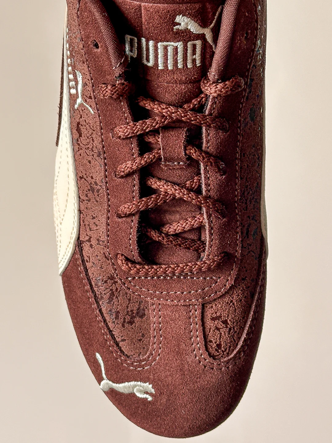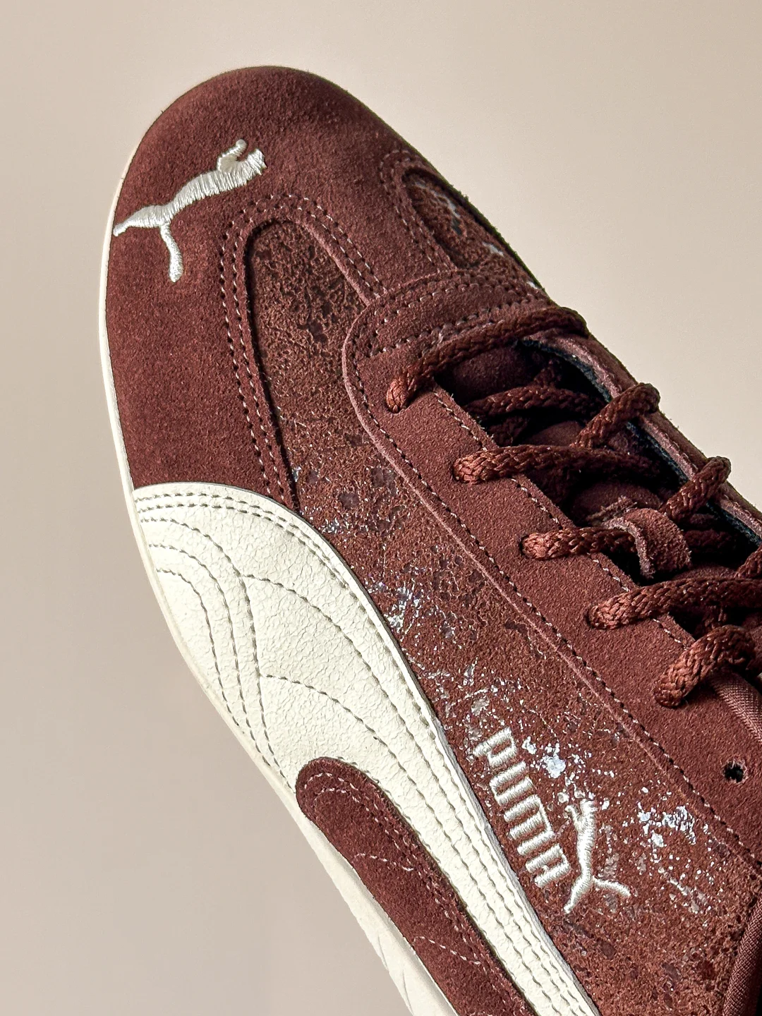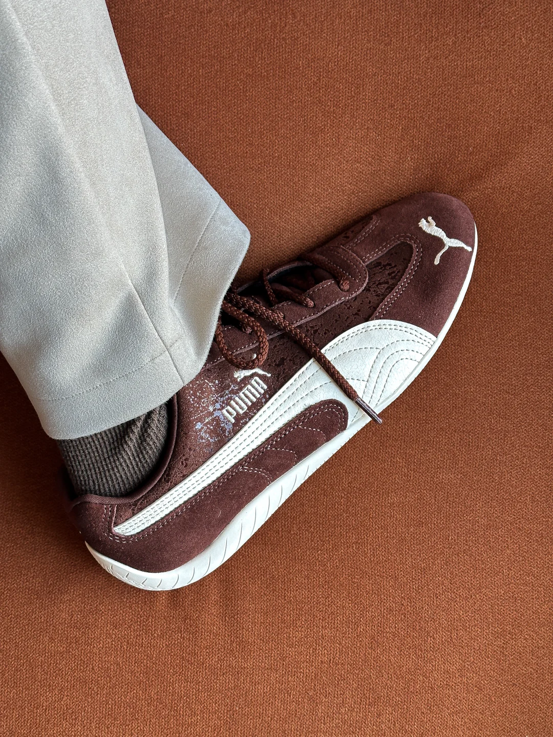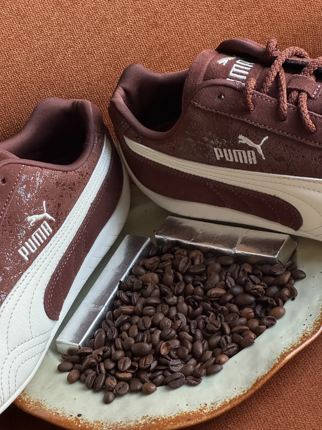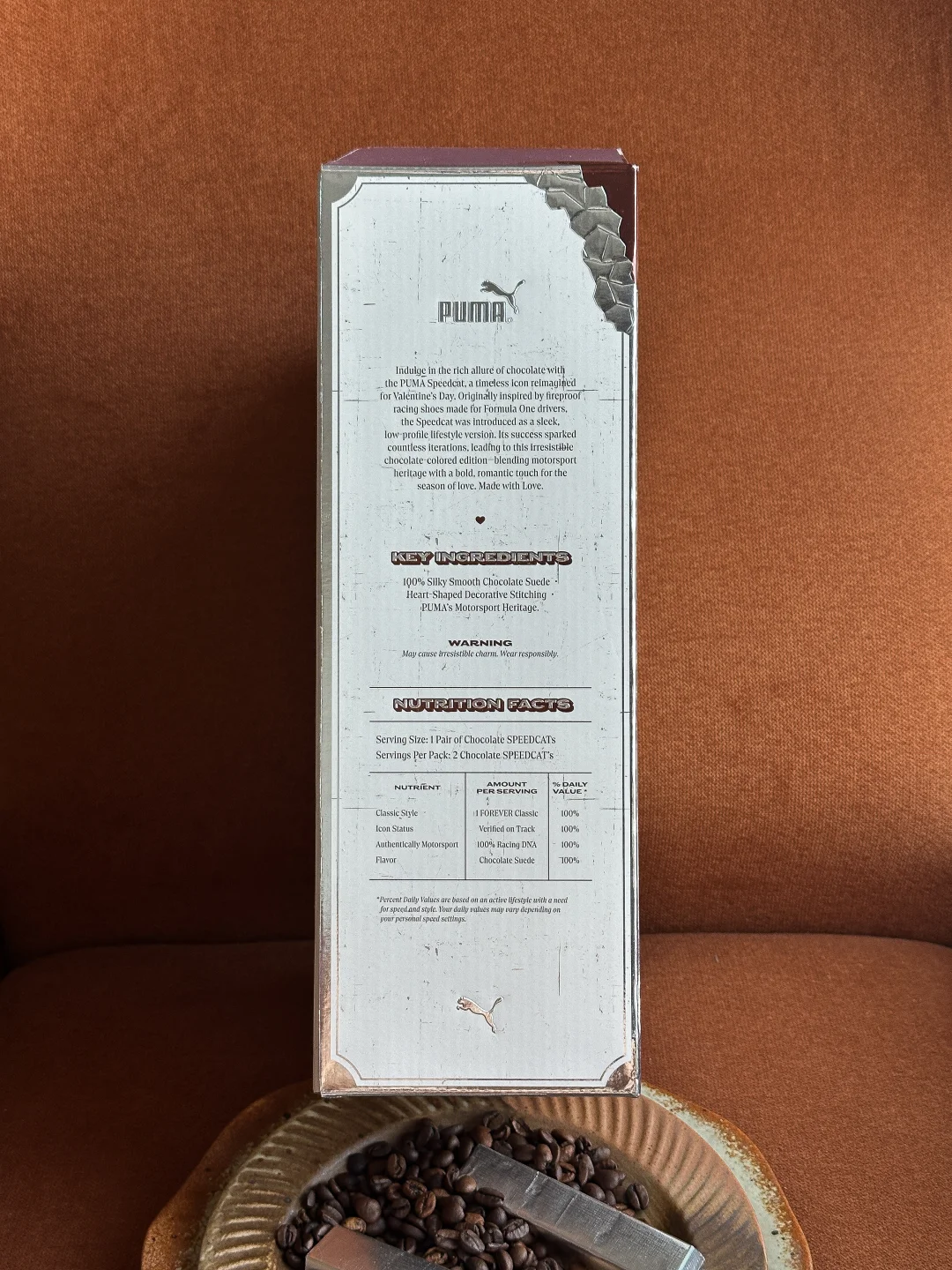 究竟巧克力味道的鞋子👟?还是鞋子形状的巧克力🍫?Puma Speedcat情人节的这一波操作也是拿捏了我。 巧克力棕色+奶白色的搭配,完美契合秋冬。 叠加特殊涂层的翻毛皮,软糯质感拉满的同时还为鞋子增加了星光点点的光泽感。 更值得说的是这次的定制鞋盒,设计和标注很有意思。可以好好研究一番。“SHOE-PER SWEET”“FLAVORFUL CHOCOLAT SPEEDCAT”值得拥有。