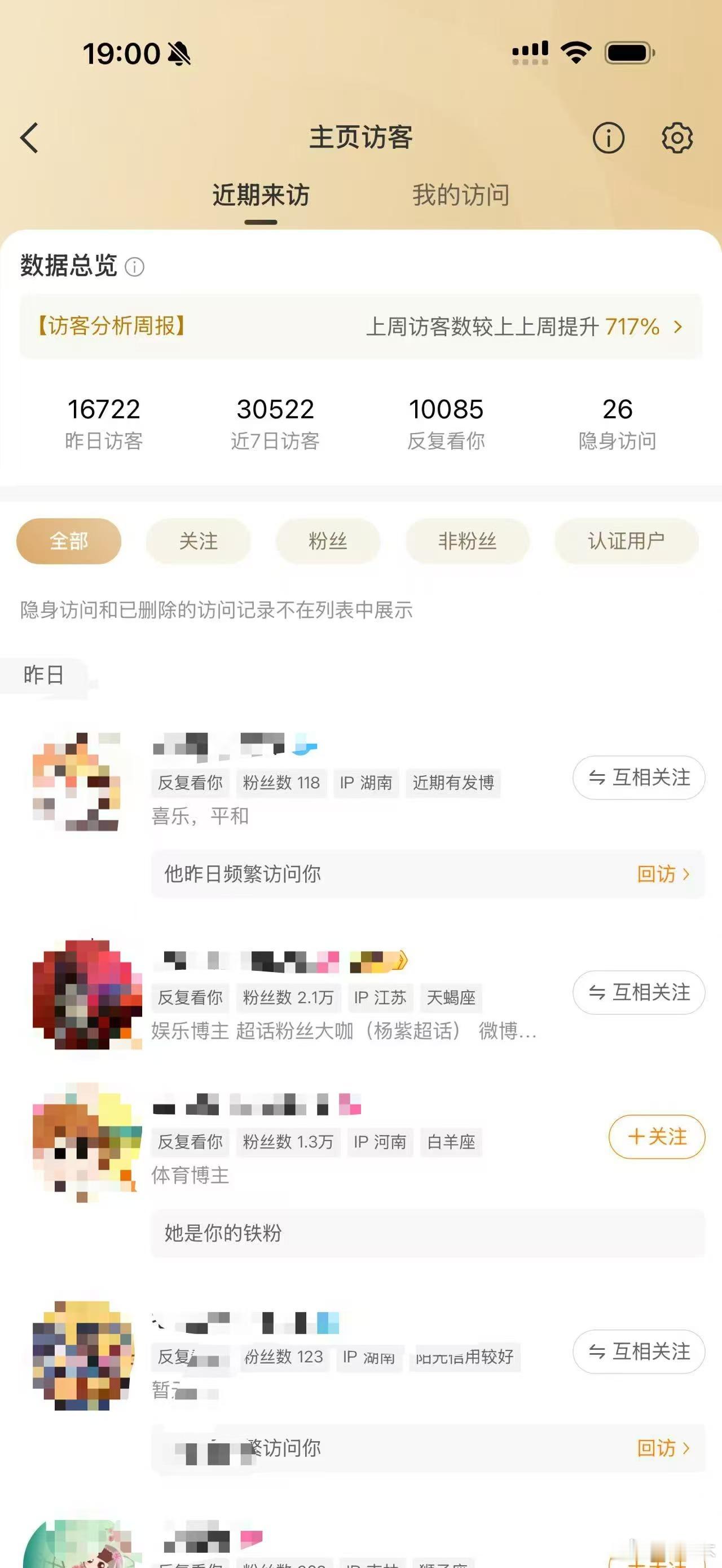 别家的粉丝很多我看了又讨厌我支持两小只,有比赛的时候又要反复看我,能让讨厌我的人反复来看我这也算是一种成功吧…因为我点开非粉丝,看到非粉丝反复看我的占大部分。
