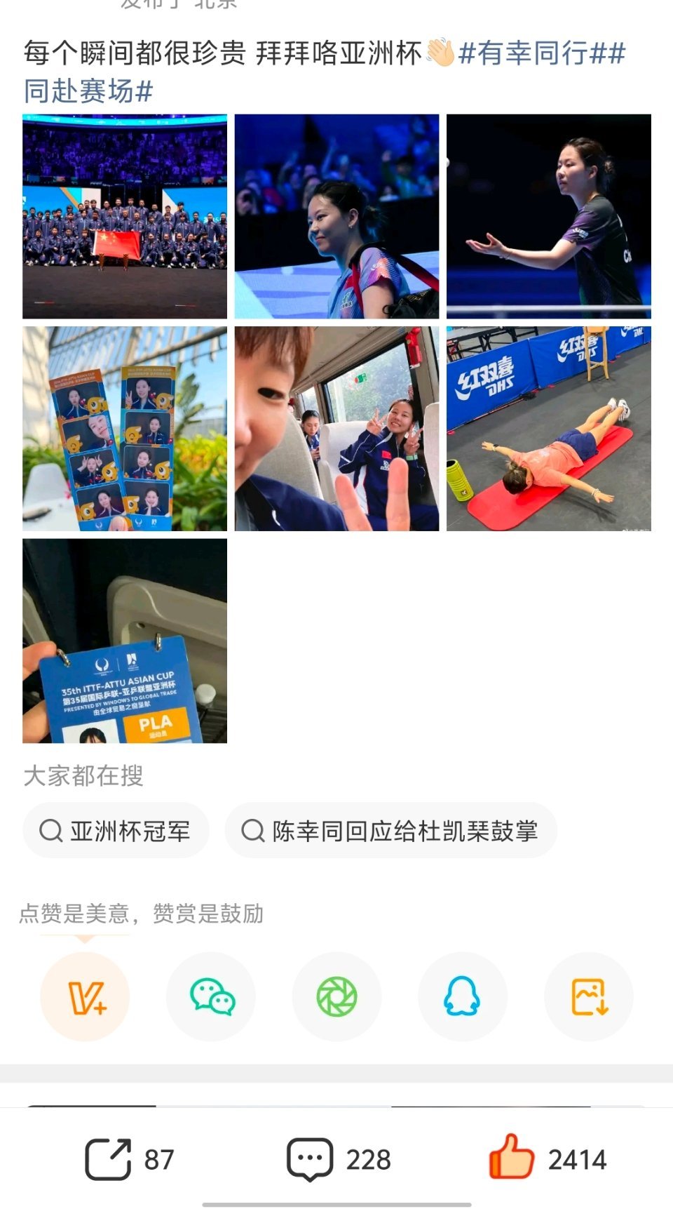 陈幸同告别亚洲杯陈幸同发博告别亚洲杯表示:每个瞬间都很珍贵期待国乒下一个赛场。