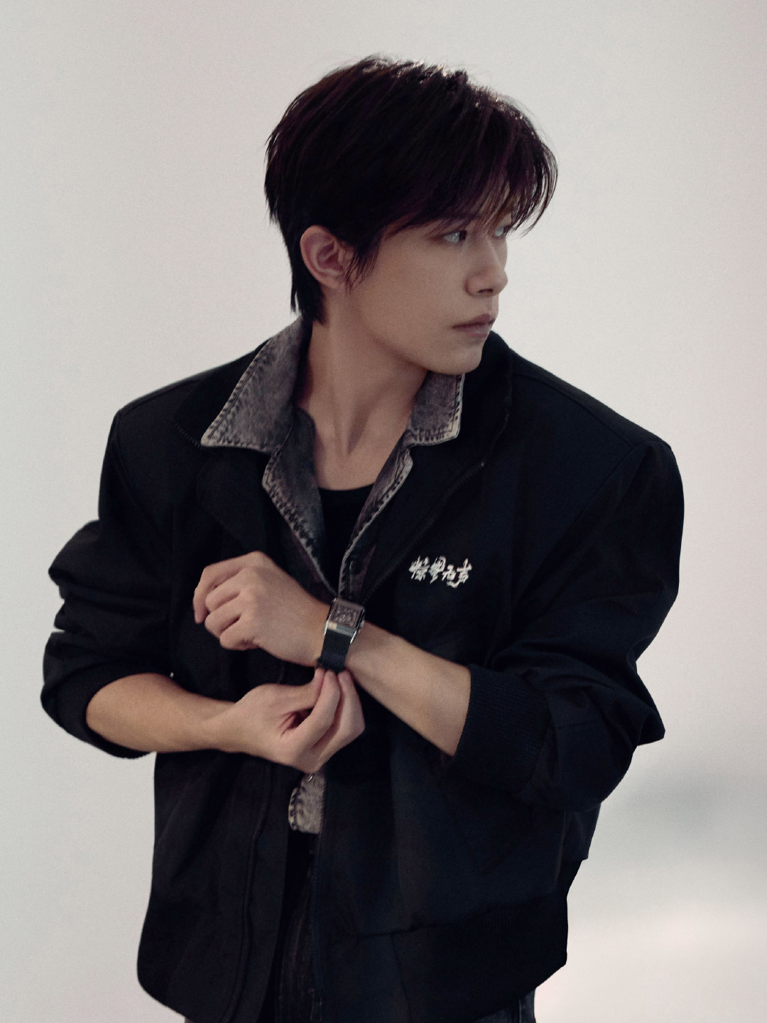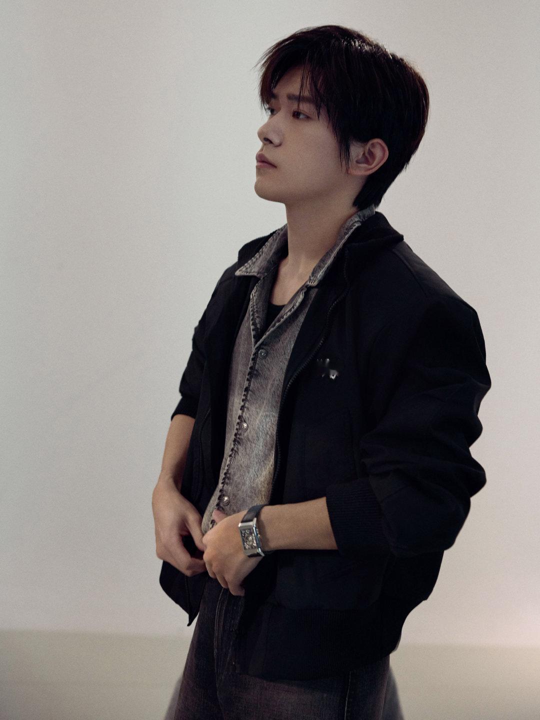 易烊千玺|春节档片单发布活动暨中国电影新春嘉年华造型出图,牛仔套装配黑色夹克,佩戴积家腕表,稳重大气,期待上映