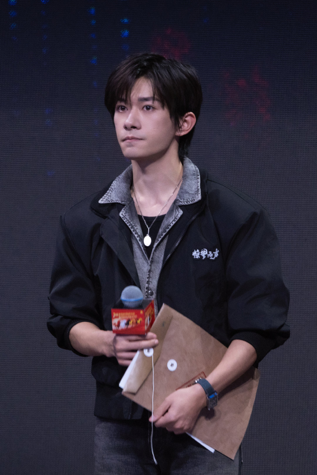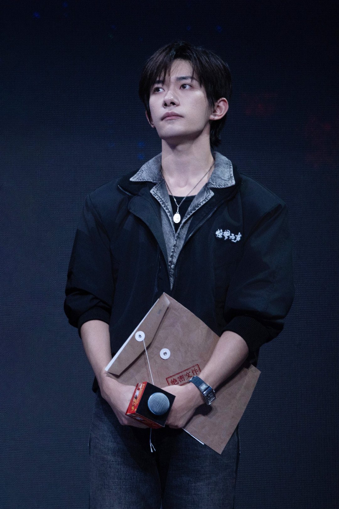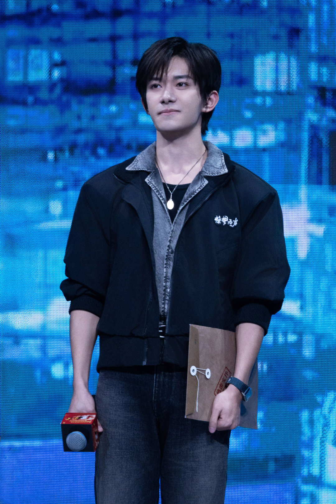 易烊千玺|春节档片单发布活动暨中国电影新春嘉年华造型出图,牛仔套装配黑色夹克,佩