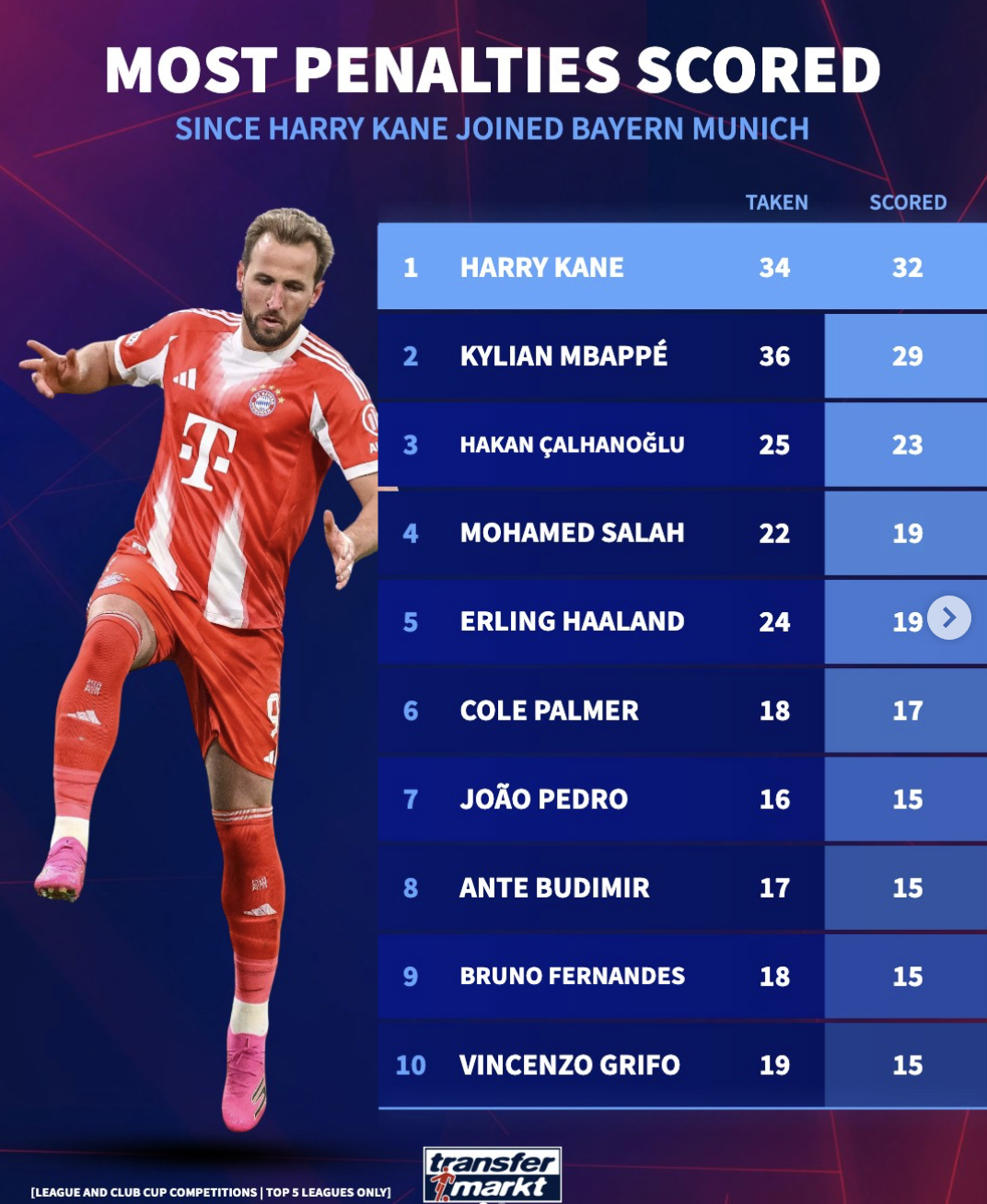 凯恩34次主罚点球打进32球居首;姆巴佩主罚36次进29球排第二;恰尔汗奥卢主罚25次进23球排第三。